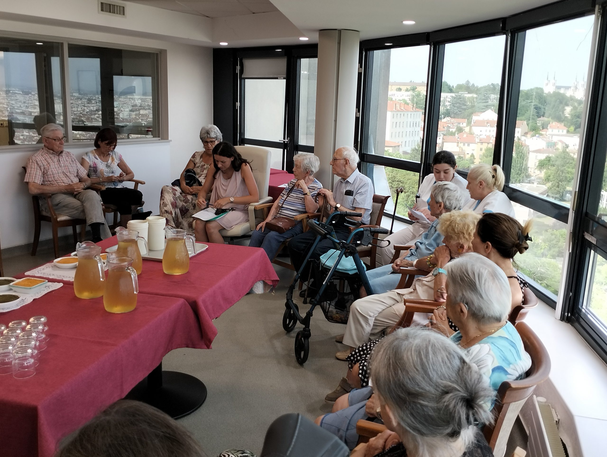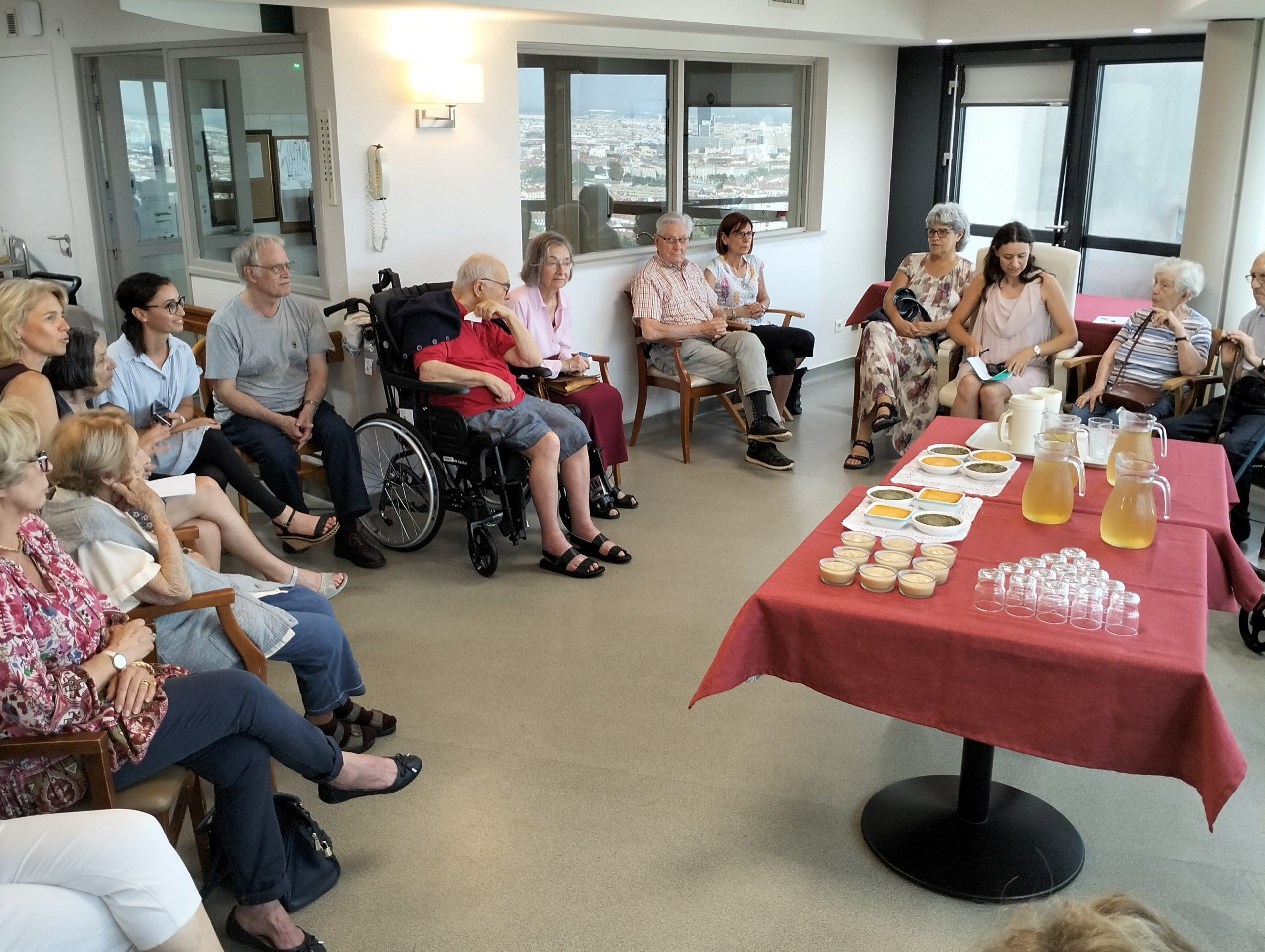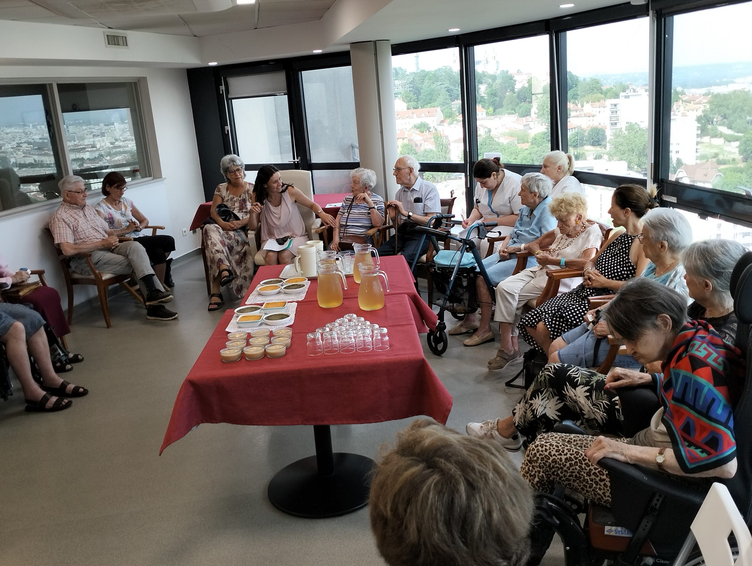 Après le 1er, 2ème et 3ème étage, le mercredi 21 juin, nous avons réalisé la réunion des familles des résidents du 4ème étage. Beaucoup de proches étaient présents. Nous avons échangé sur de nombreux sujets : présentation de la nouvelle responsable hôtelière – équipe en place au 4ème étage – Plan de Continuité d’Activité sur l’été – campagne annuelle des enquêtes de satisfaction résidents et familles du 1er juin au 30 juin 2023 – mise en place des nouvelles nappes et serviettes de tables dans la salle à manger de l’étage – nouveau mobilier en commande – nouvelle signalétique intérieure et extérieure – barbecues dans le parc et sorties extérieures – livraison des nouveaux lits et matelas le lundi 12 juin – formation des équipes – mise en place de nouveaux horaires en lingerie – enquête dénutrition et plan canicule. Nous avons réalisé un tour de table afin que chacun puisse s’exprimer. Des échanges constructifs avec à la fin de la réunion, une collation avec notamment la dégustation de plats mixés.