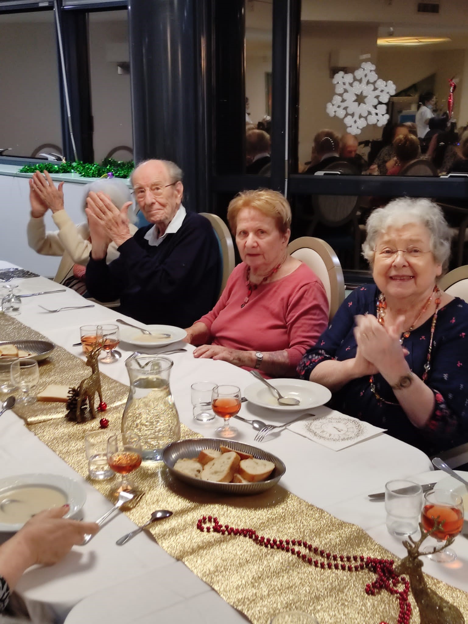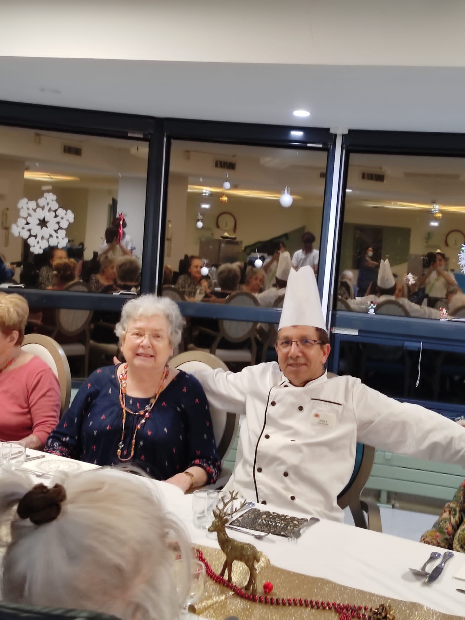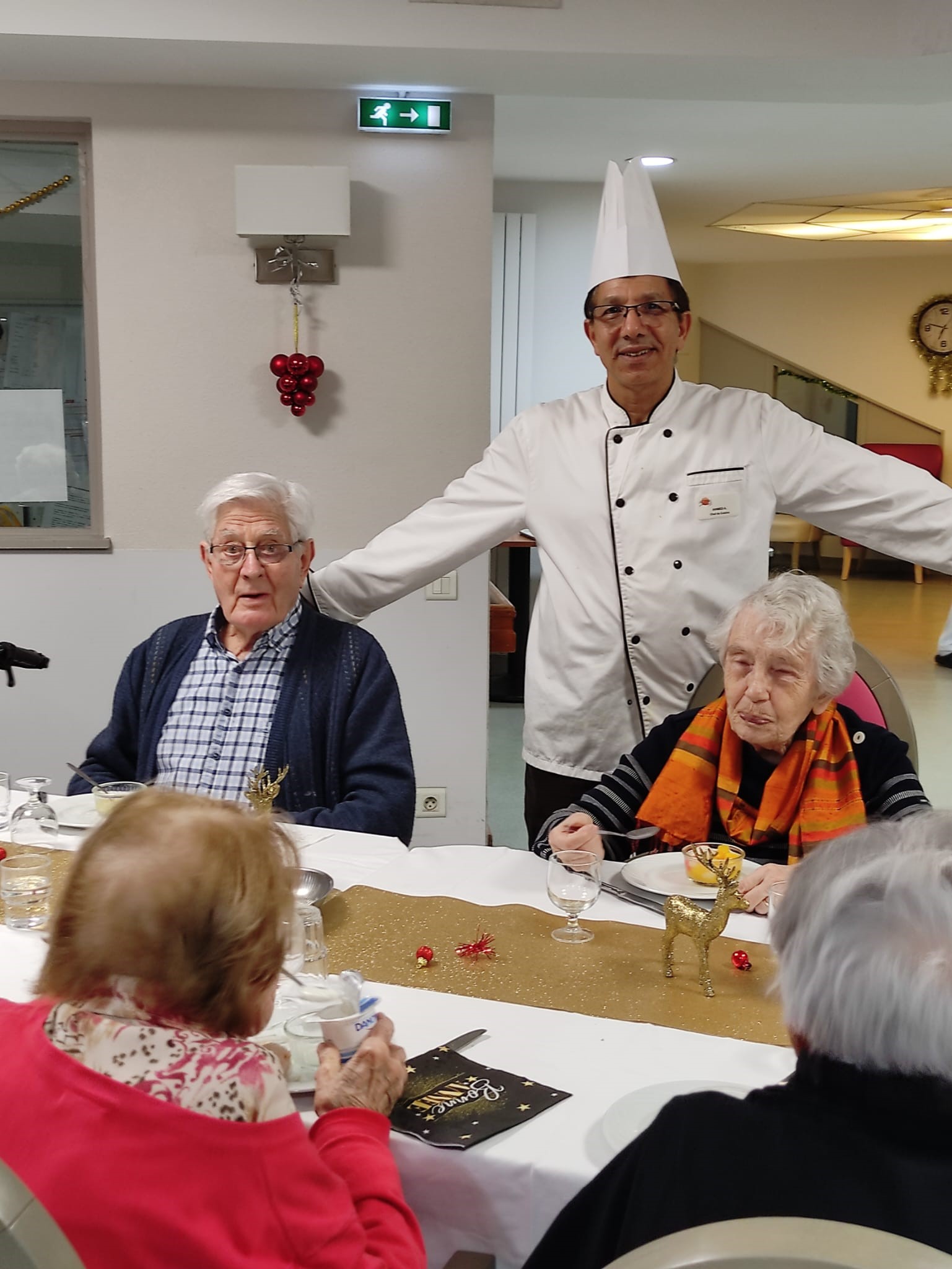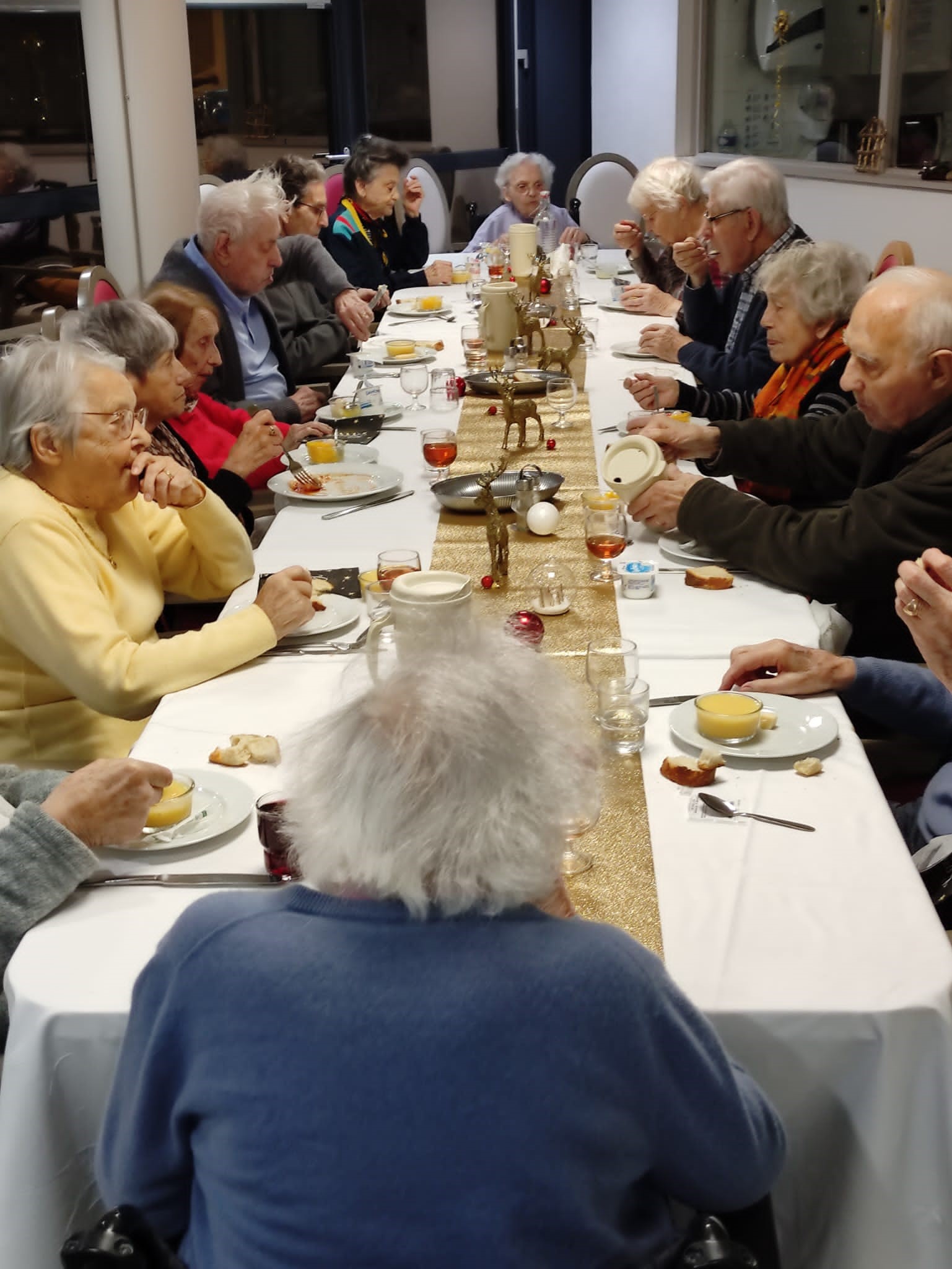 Les résidents ont profité d’une belle ambiance et d’un bon repas pour le réveillon du 31 décembre. Au menu : velouté d’asperges – boudin sauce grand mère – fromage – salade de fruits frais. Merci à l’équipe de cuisine, aux soignants et aux agents hôteliers très investis avec beaucoup de bienveillance.