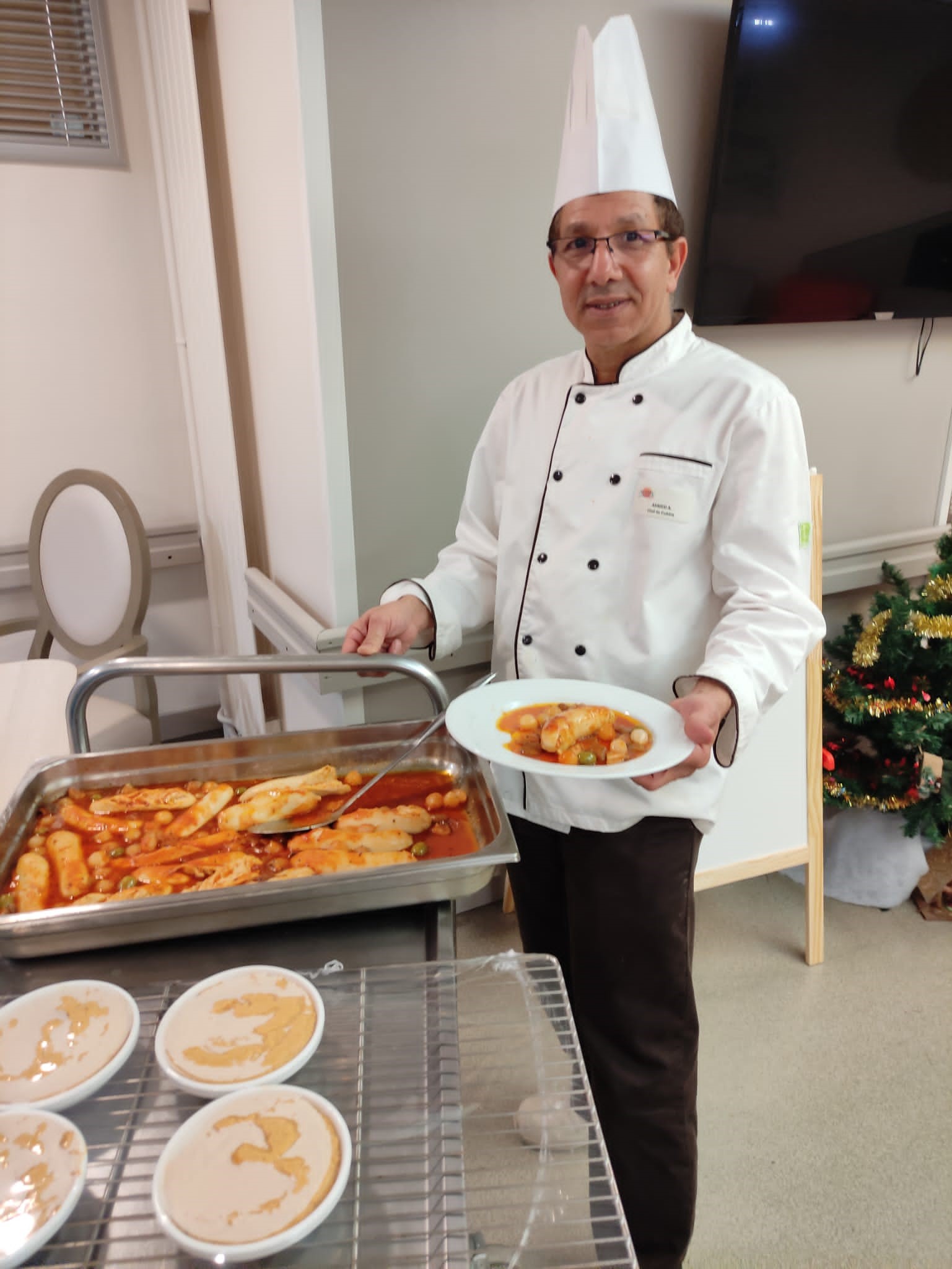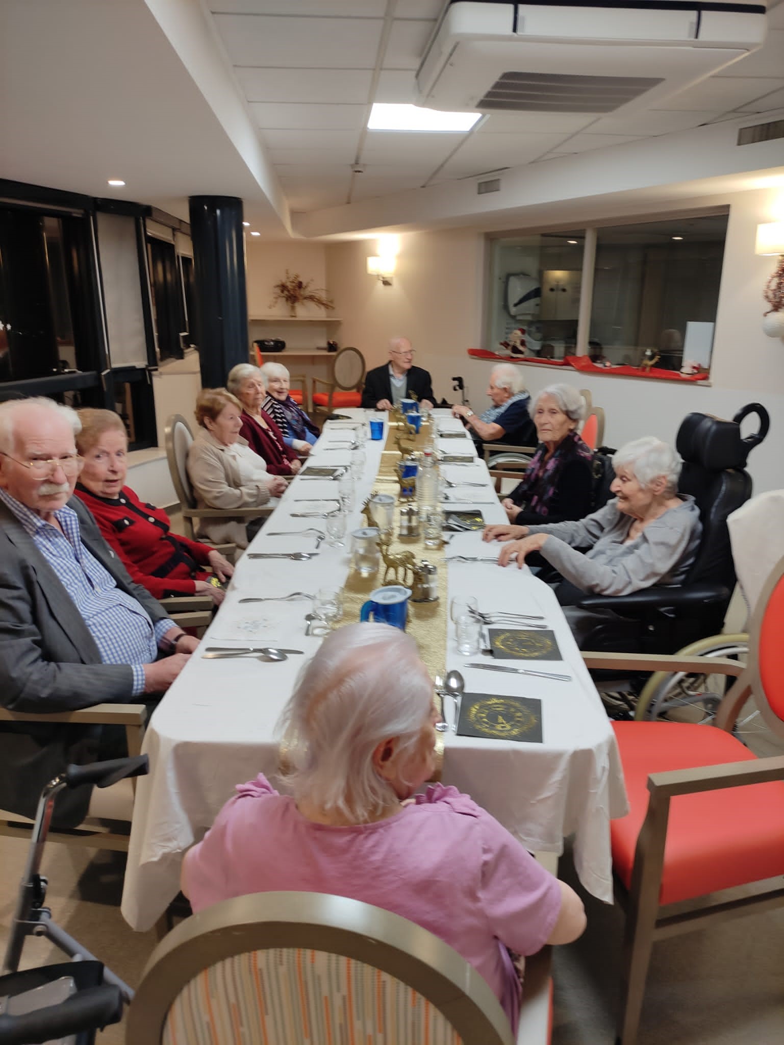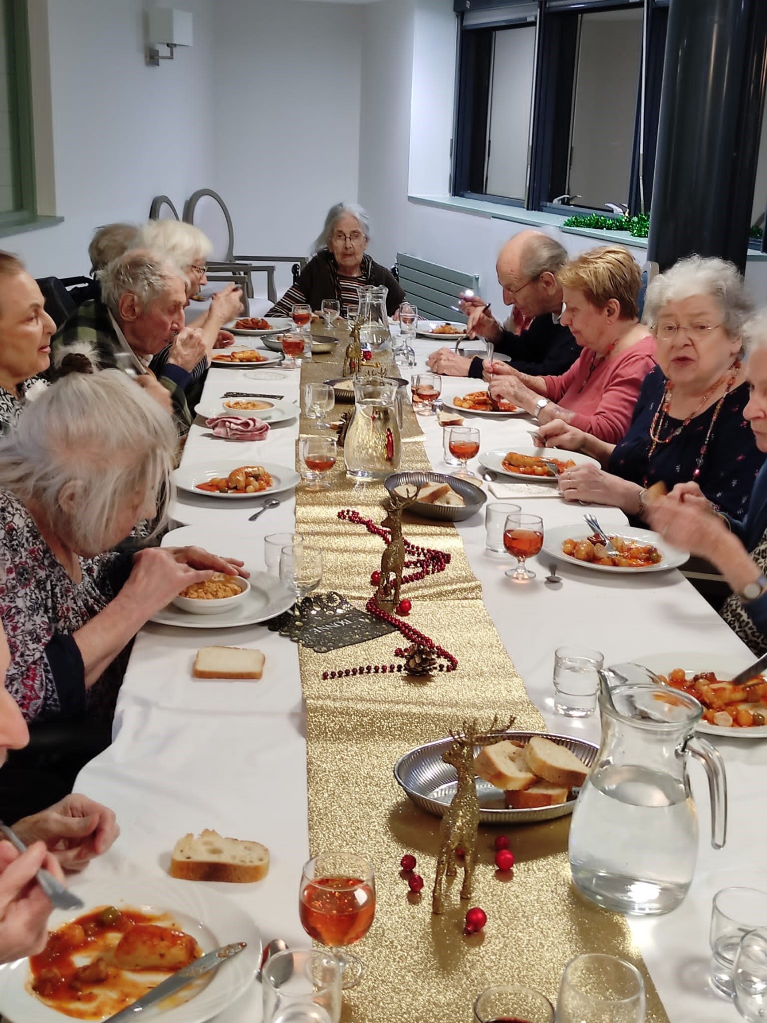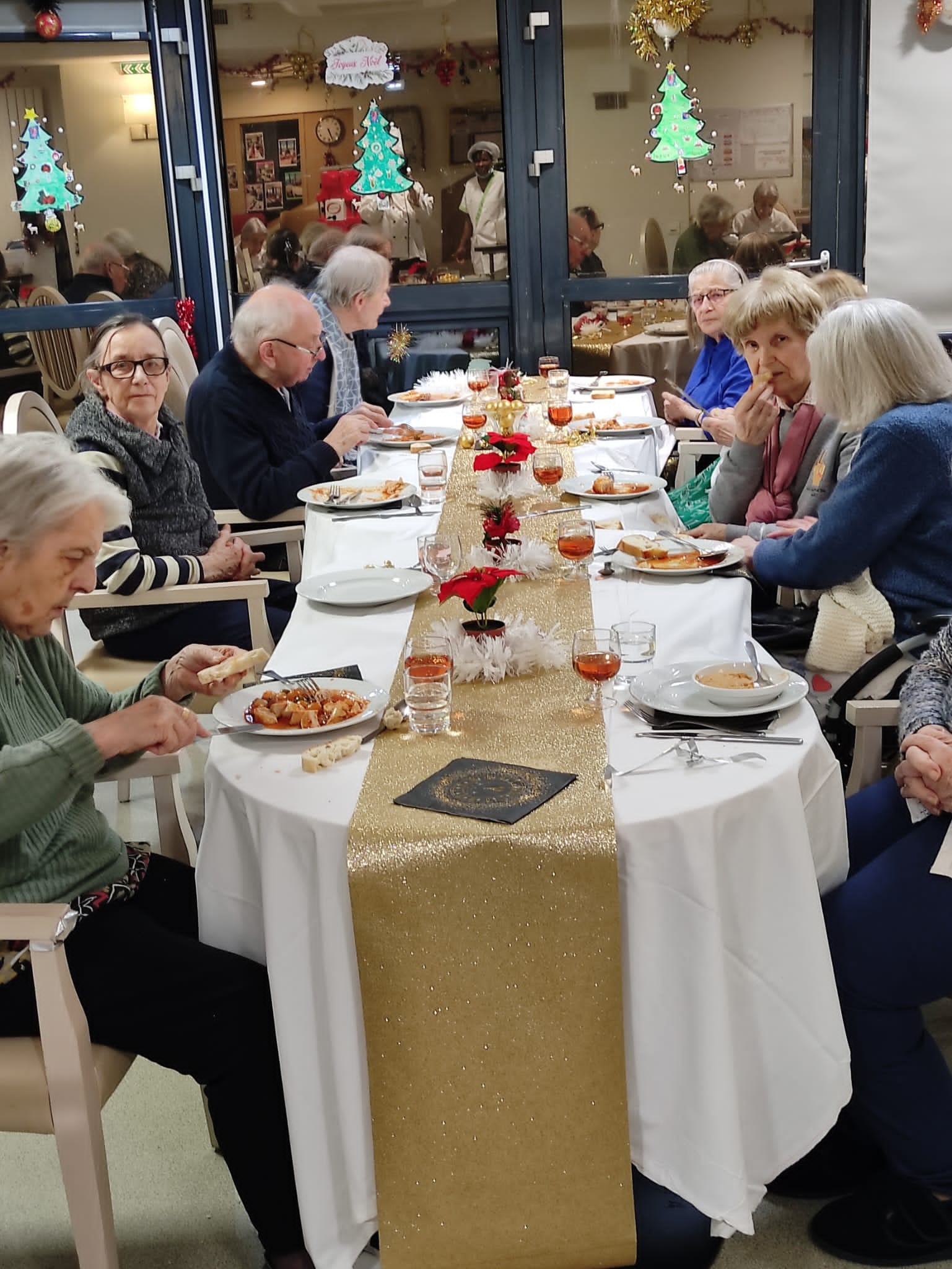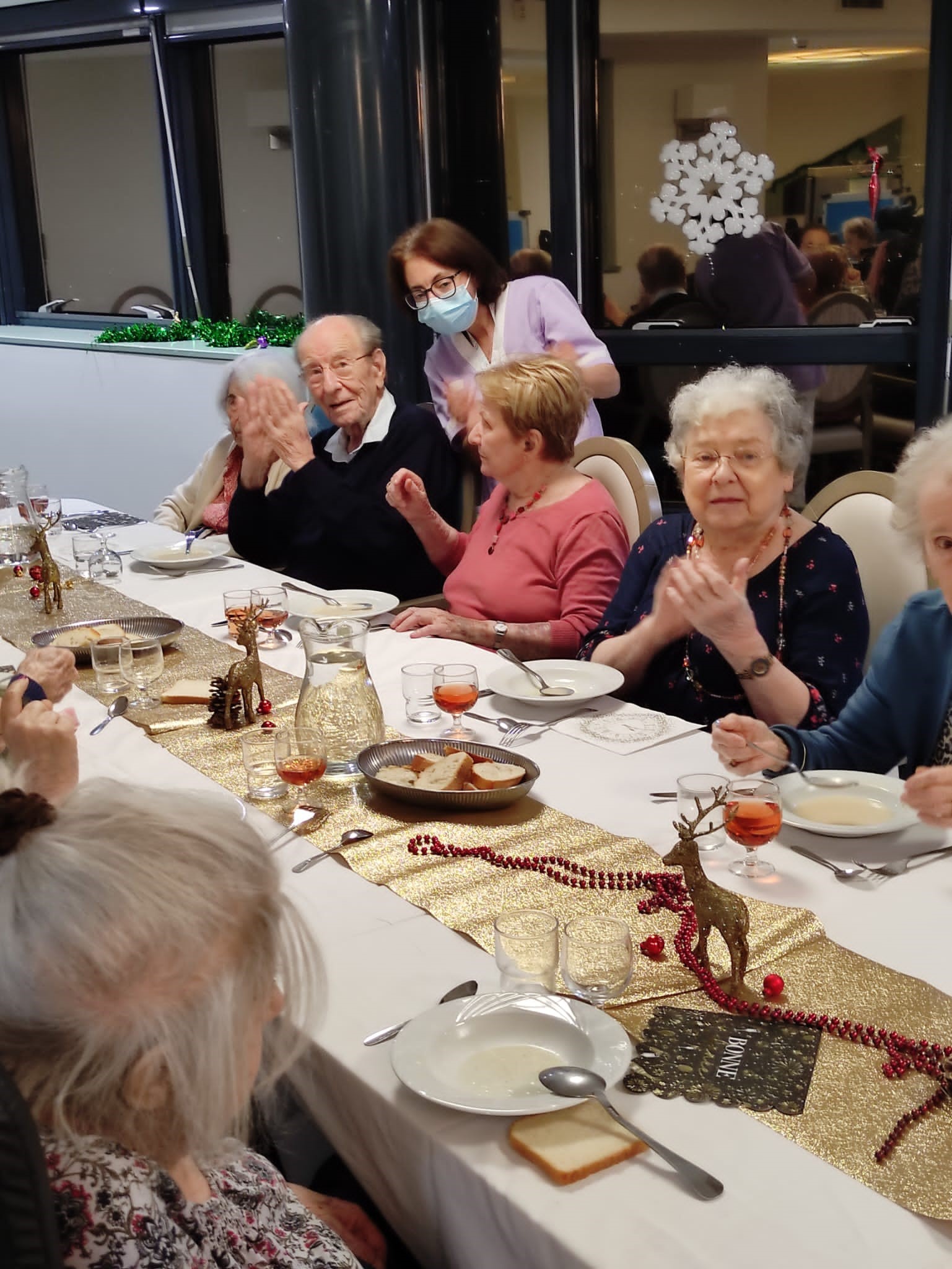 Les résidents ont profité d’une belle ambiance et d’un bon repas pour le réveillon du 31 décembre. Au menu : velouté d’asperges – boudin sauce grand mère – fromage – salade de fruits frais. Merci à l’équipe de cuisine, aux soignants et aux agents hôteliers très investis avec beaucoup de bienveillance.