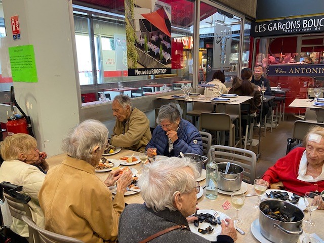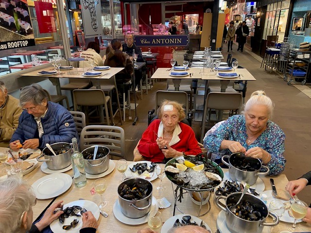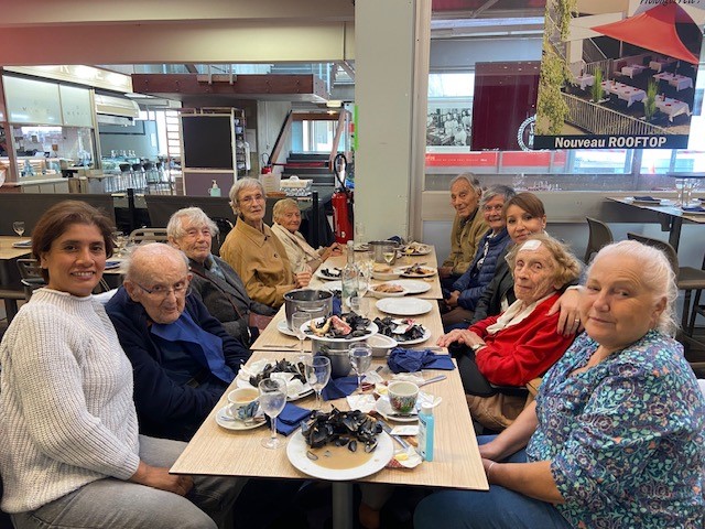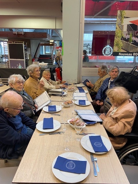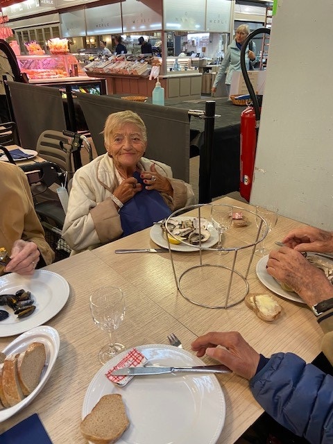 Dans le cadre de la Semaine Bleue, jeudi matin, nous avons organisé une sortie aux halles Bocuse. Les résidents pour leur plus grand bonheur ont dégusté des huitres et des moules et sont allés acheter des gratons lyonnais pour le déjeuner aux Amandines. Les résidents étaient ravis de cette sortie.