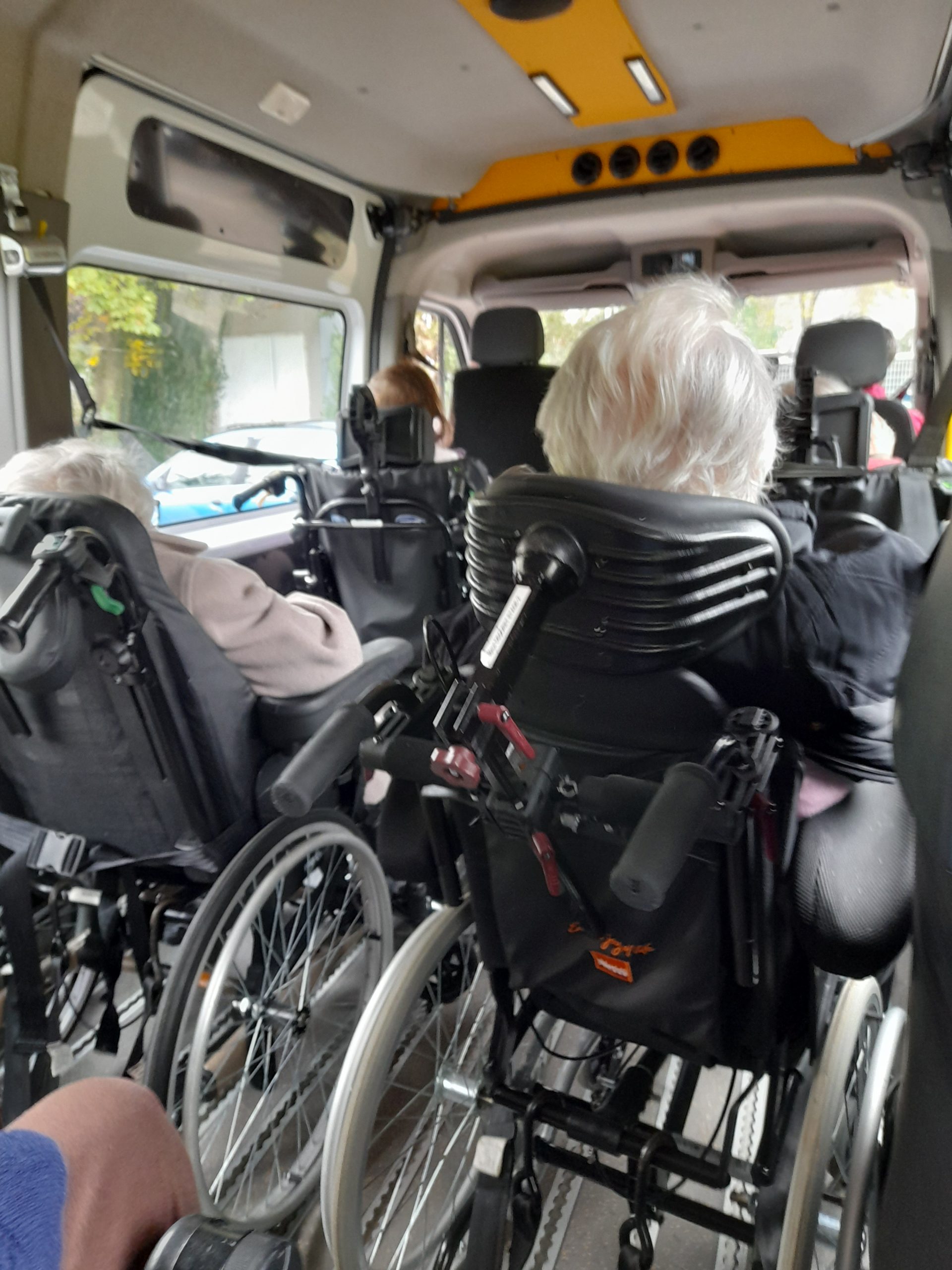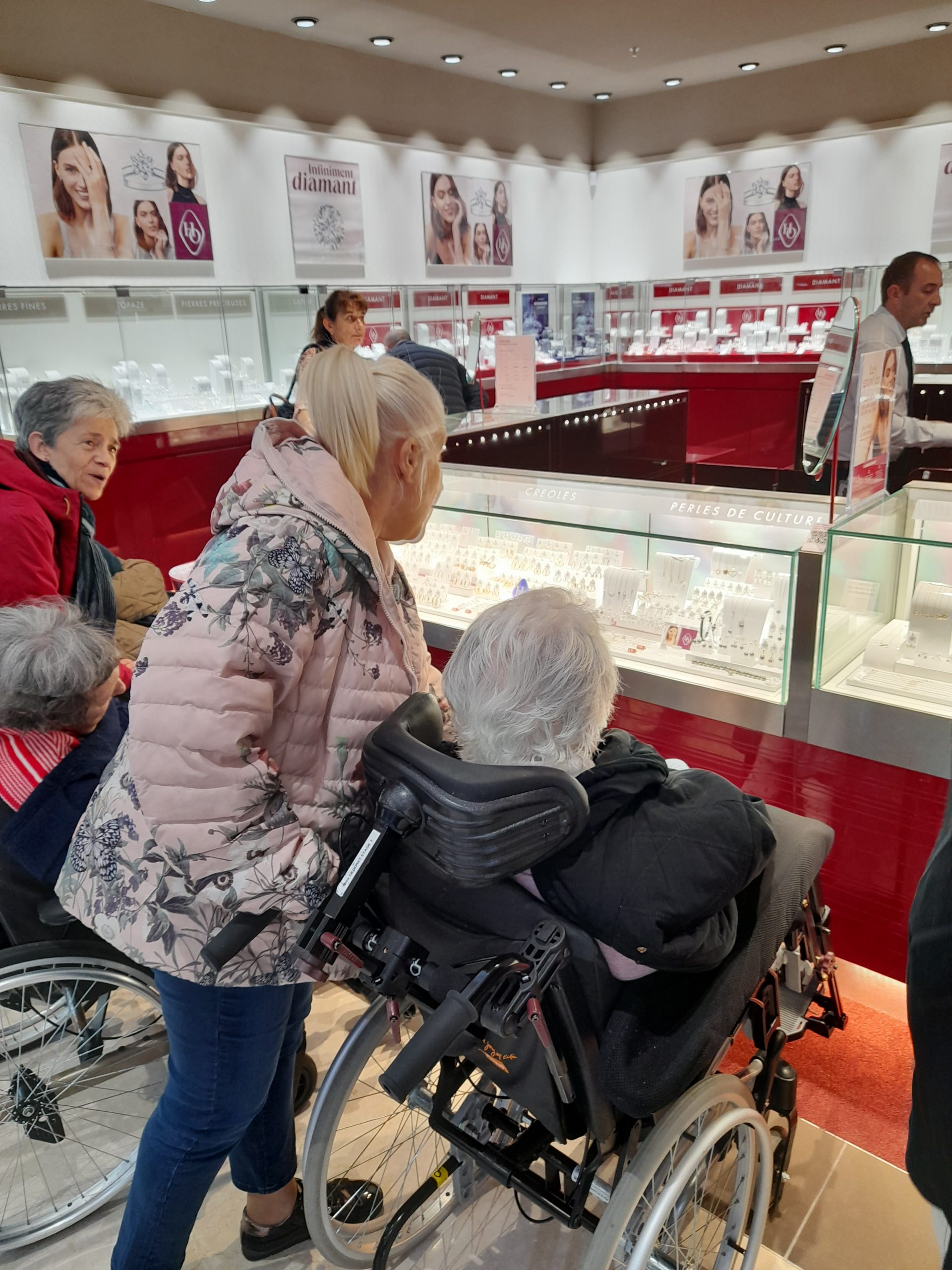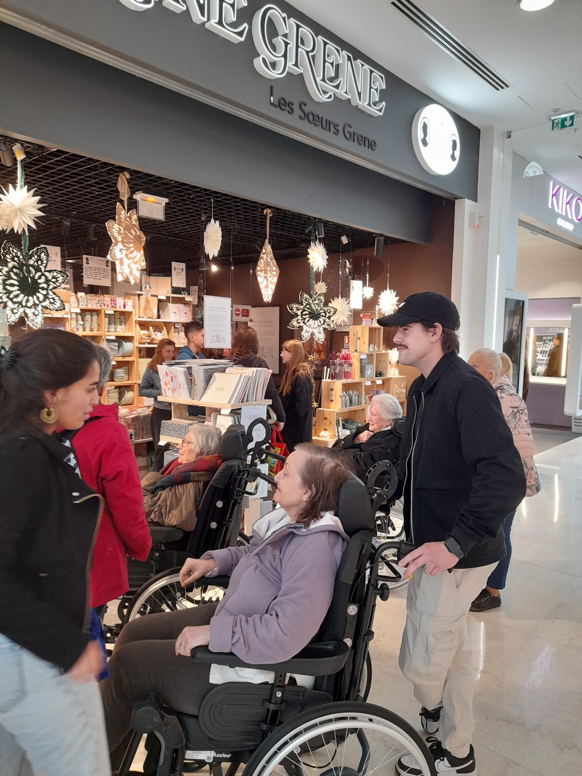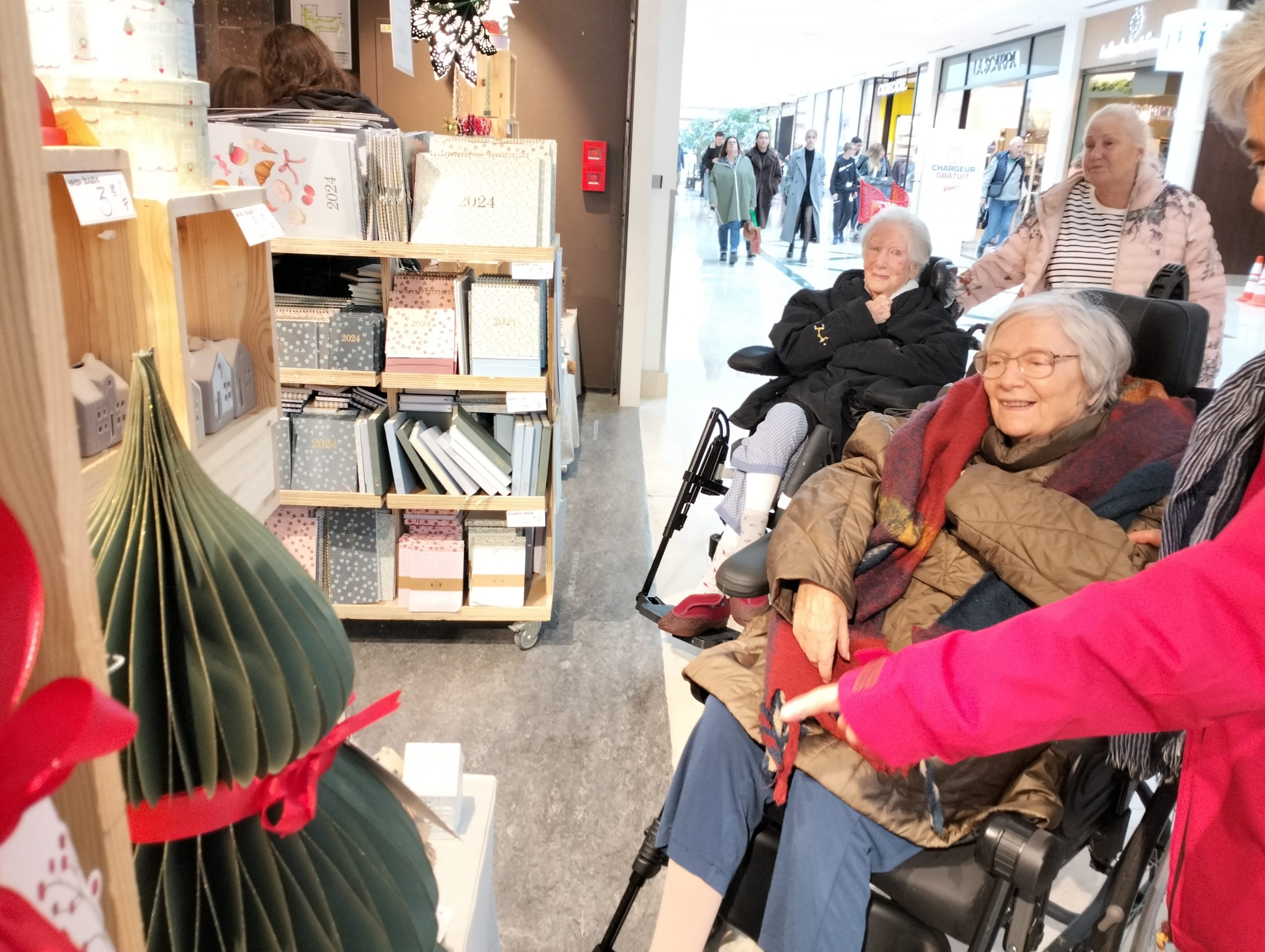 Régulièrement, nous louons un véhicule adapté pour permettre aux résidents en fauteuil confort sans appuis de pouvoir sortir. Jeudi 2 novembre, un groupe de résidentes accompagnées d’une famille, d’Elisabeth, de Clara et du binôme en service civique Arthur et Alexandre sont sortis dans une galerie marchande. Au programme, balade et découverte des magasins, observation des décorations d’halloween et du début déjà des décorations de Noël. Pour finir leur tour, ils ont fait une pause café et gouter. Ce moment a été fortement apprécié des résidentes qui n’avaient plus fait les magasins depuis longtemps et qui étaient contentes de flâner entre les boutiques.