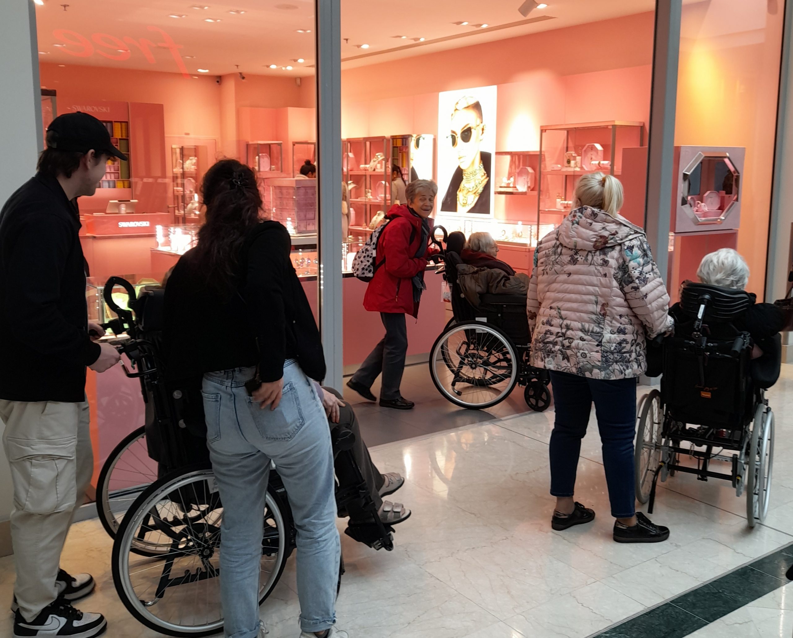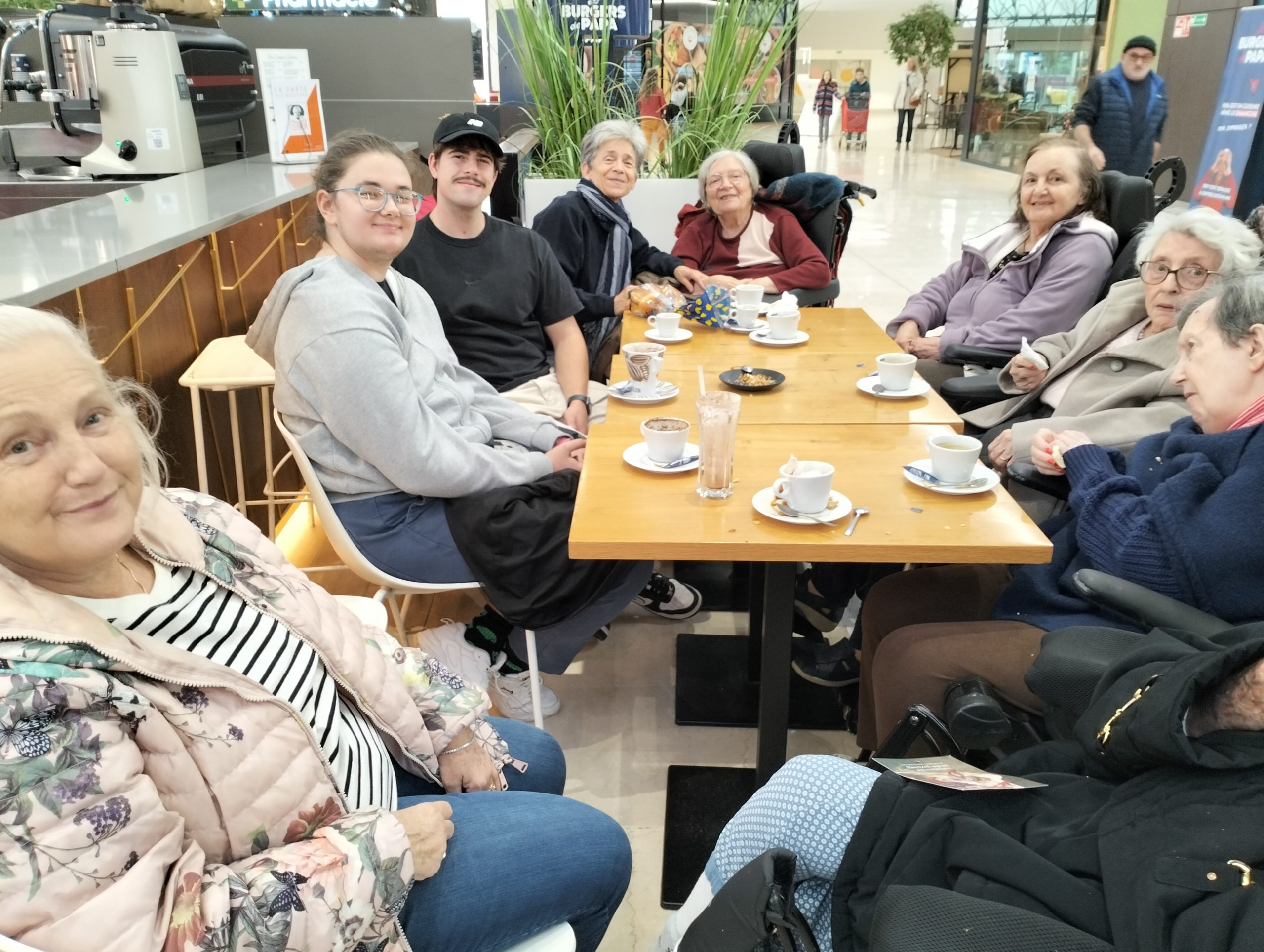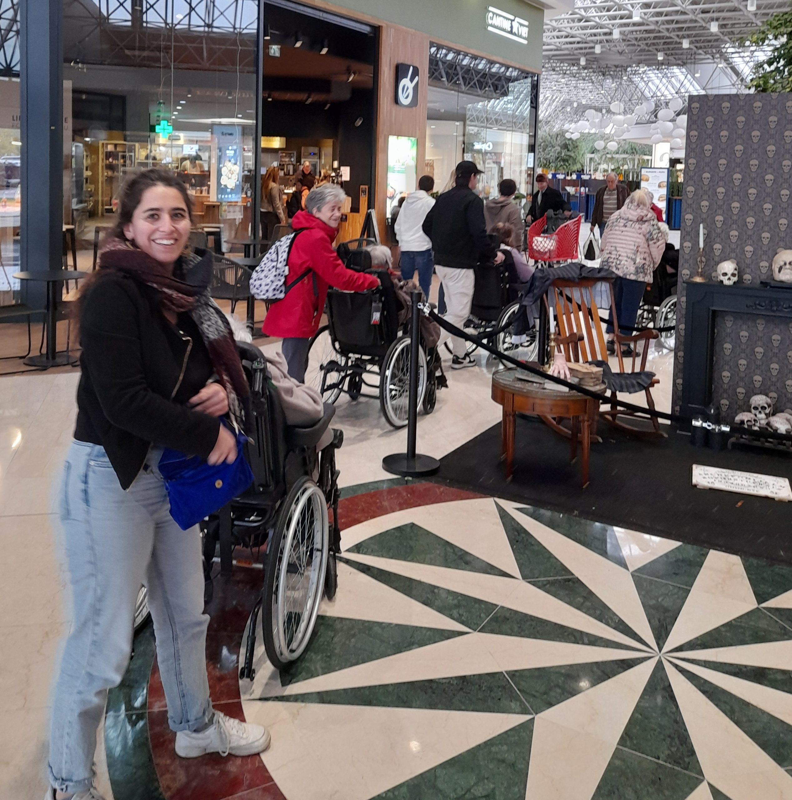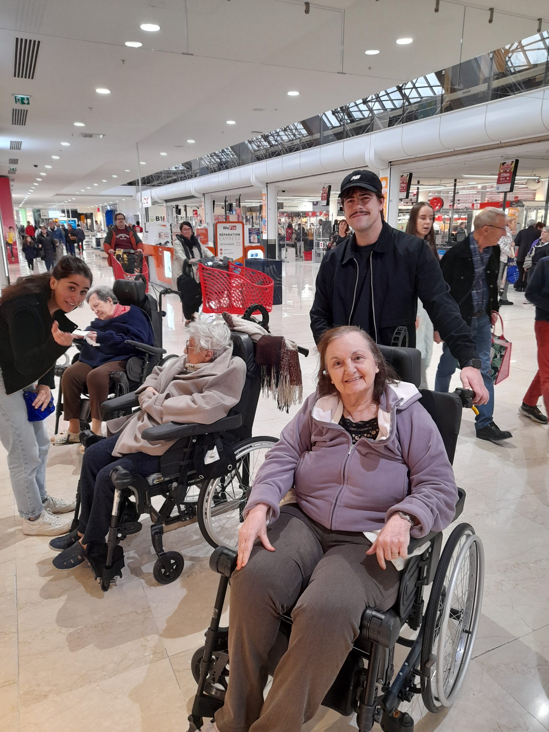 Régulièrement, nous louons un véhicule adapté pour permettre aux résidents en fauteuil confort sans appuis de pouvoir sortir. Jeudi 2 novembre, un groupe de résidentes accompagnées d’une famille, d’Elisabeth, de Clara et du binôme en service civique Arthur et Alexandre sont sortis dans une galerie marchande. Au programme, balade et découverte des magasins, observation des décorations d’halloween et du début déjà des décorations de Noël. Pour finir leur tour, ils ont fait une pause café et gouter. Ce moment a été fortement apprécié des résidentes qui n’avaient plus fait les magasins depuis longtemps et qui étaient contentes de flâner entre les boutiques.