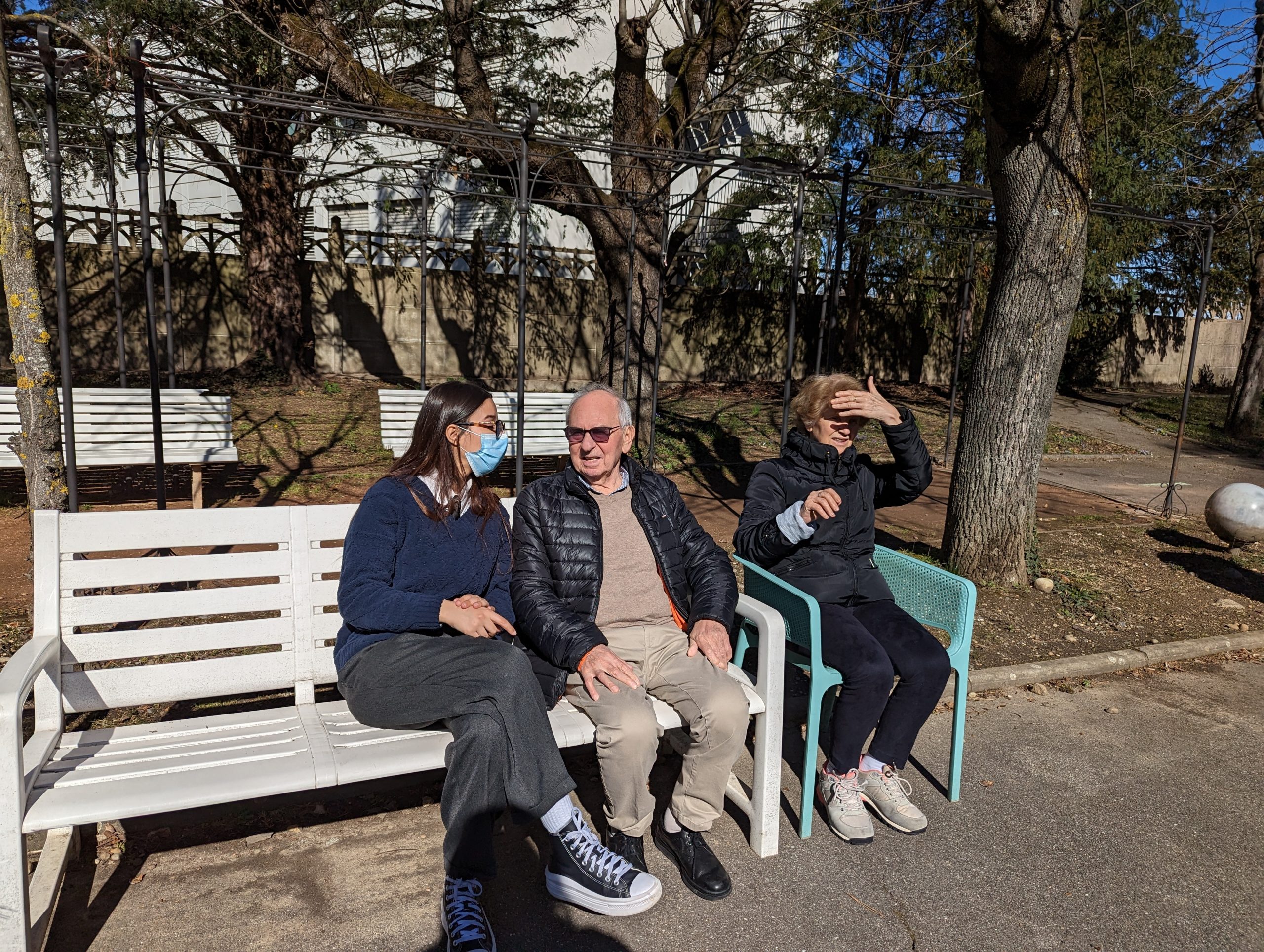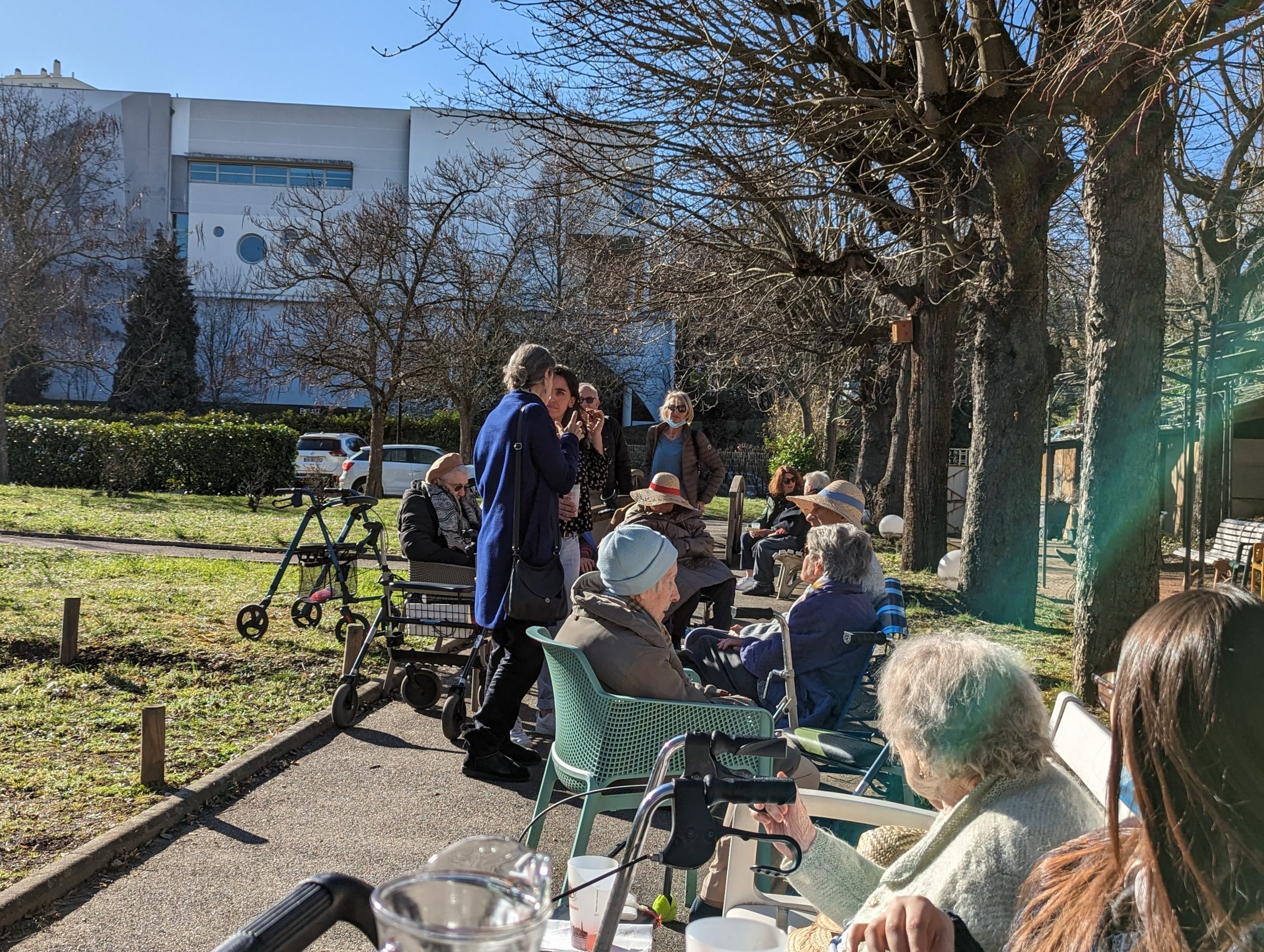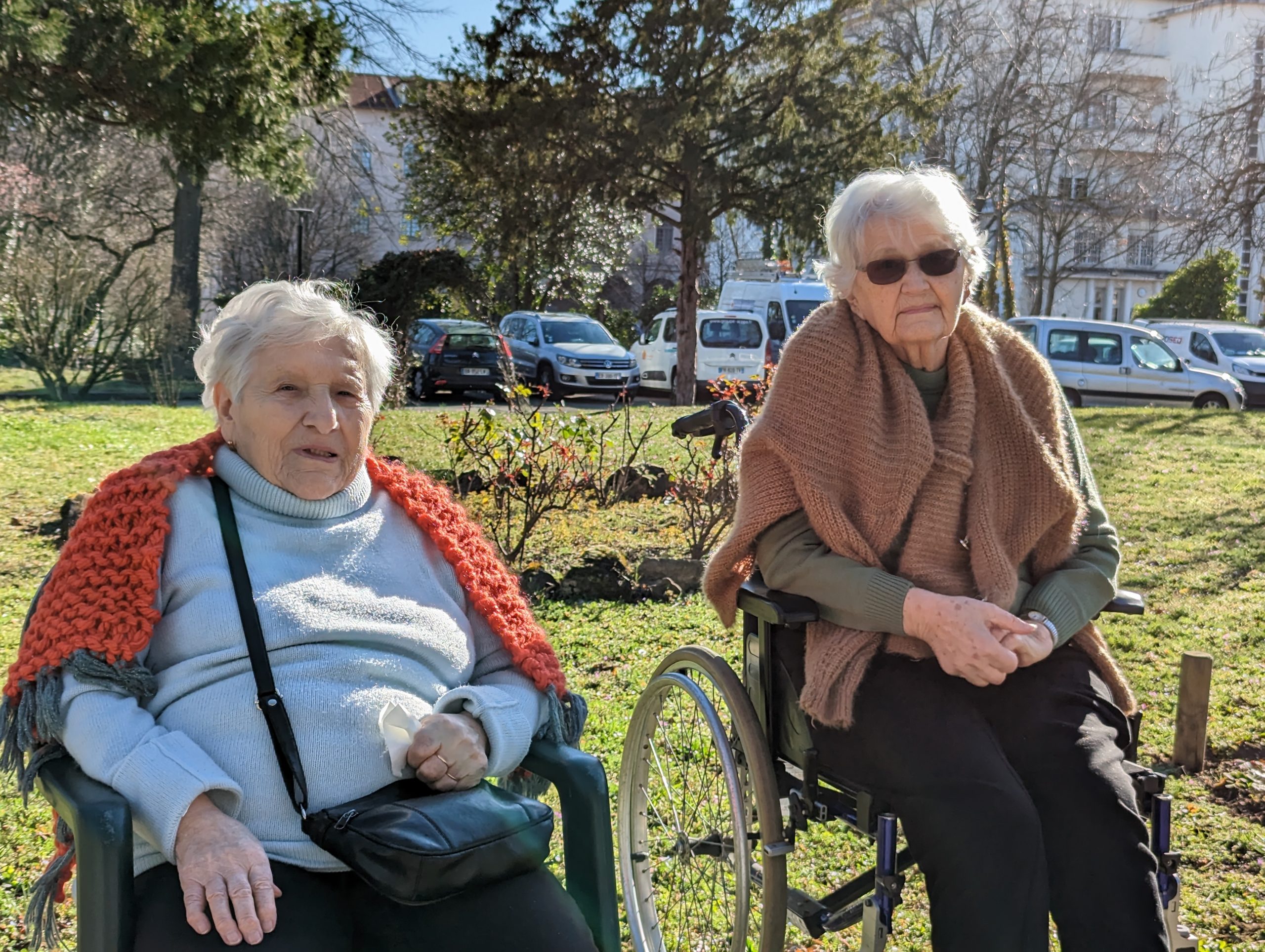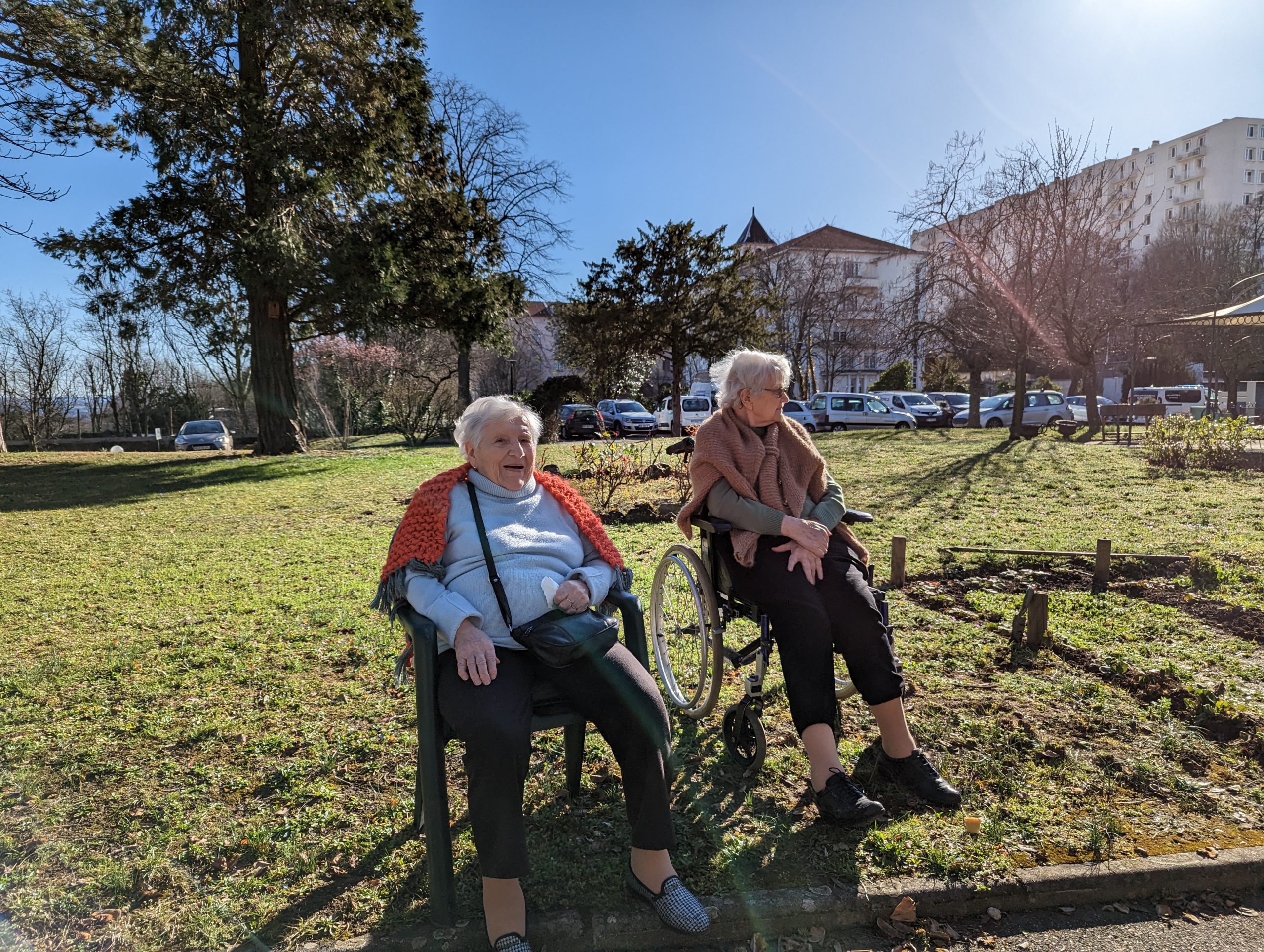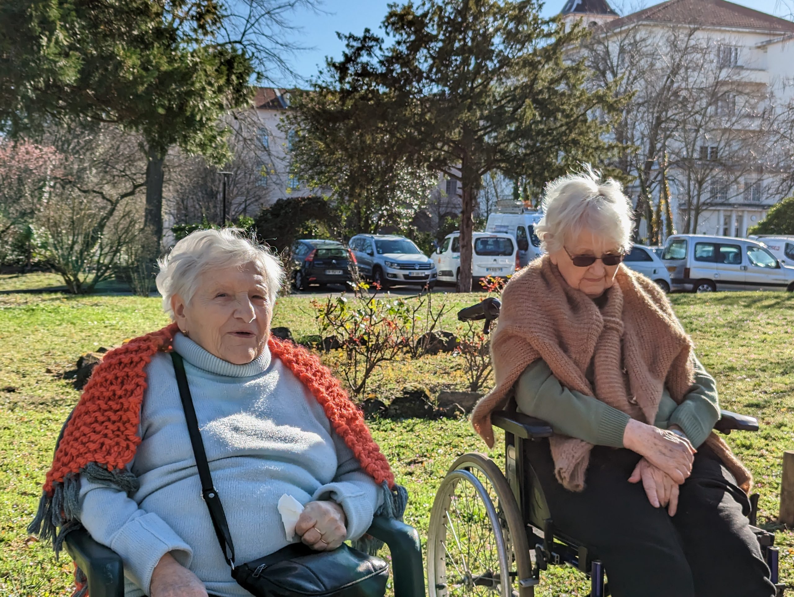 Chloé et Feyza en service civique aux Amandines profitent de l’arrivée des beaux jours pour proposer aux résidents de sortir dans le parc. Entre balade, discussion et jardinage, les résidents sont heureux de ces moments privilégiés qui leur permettent de prendre l’air.