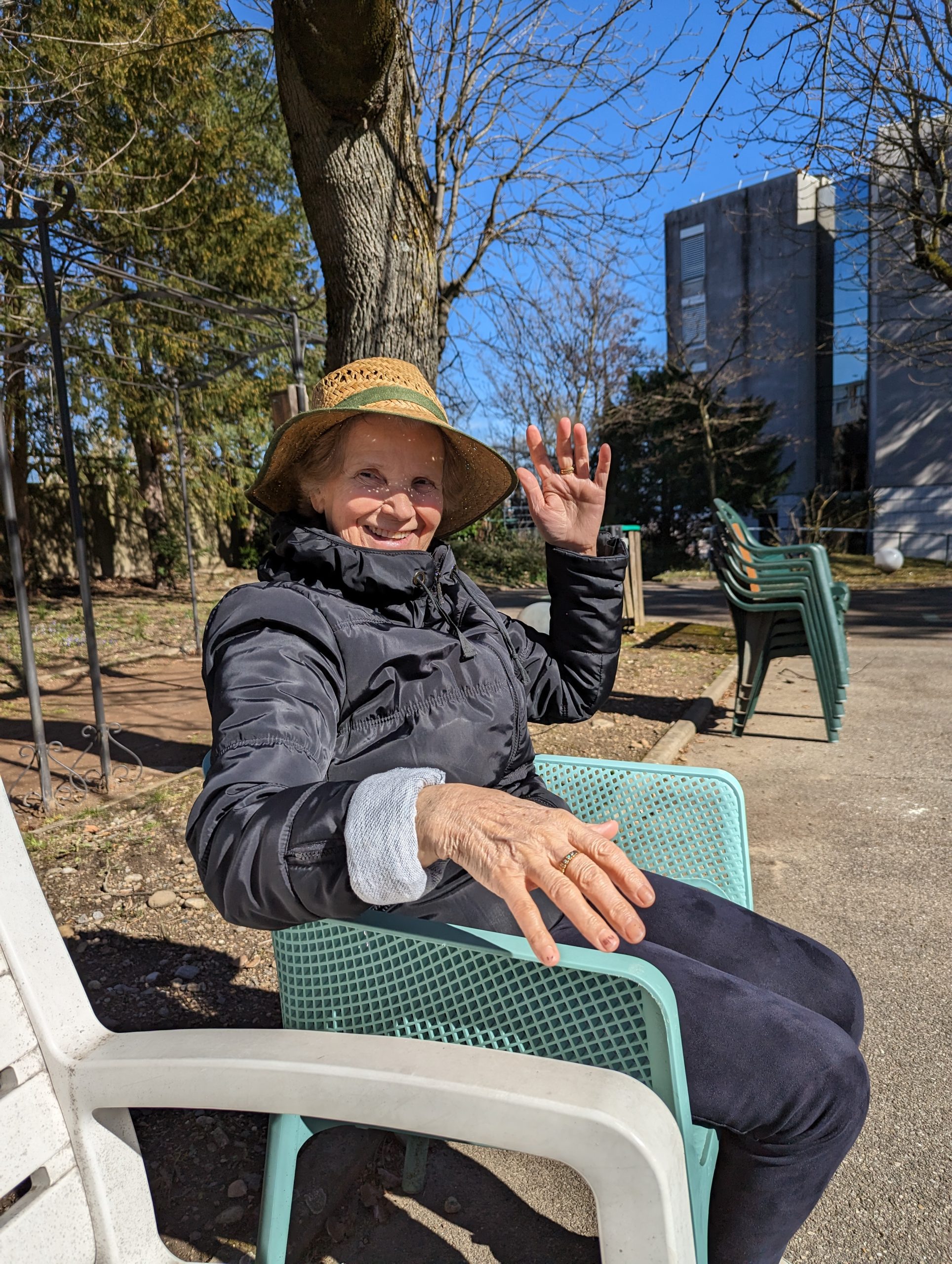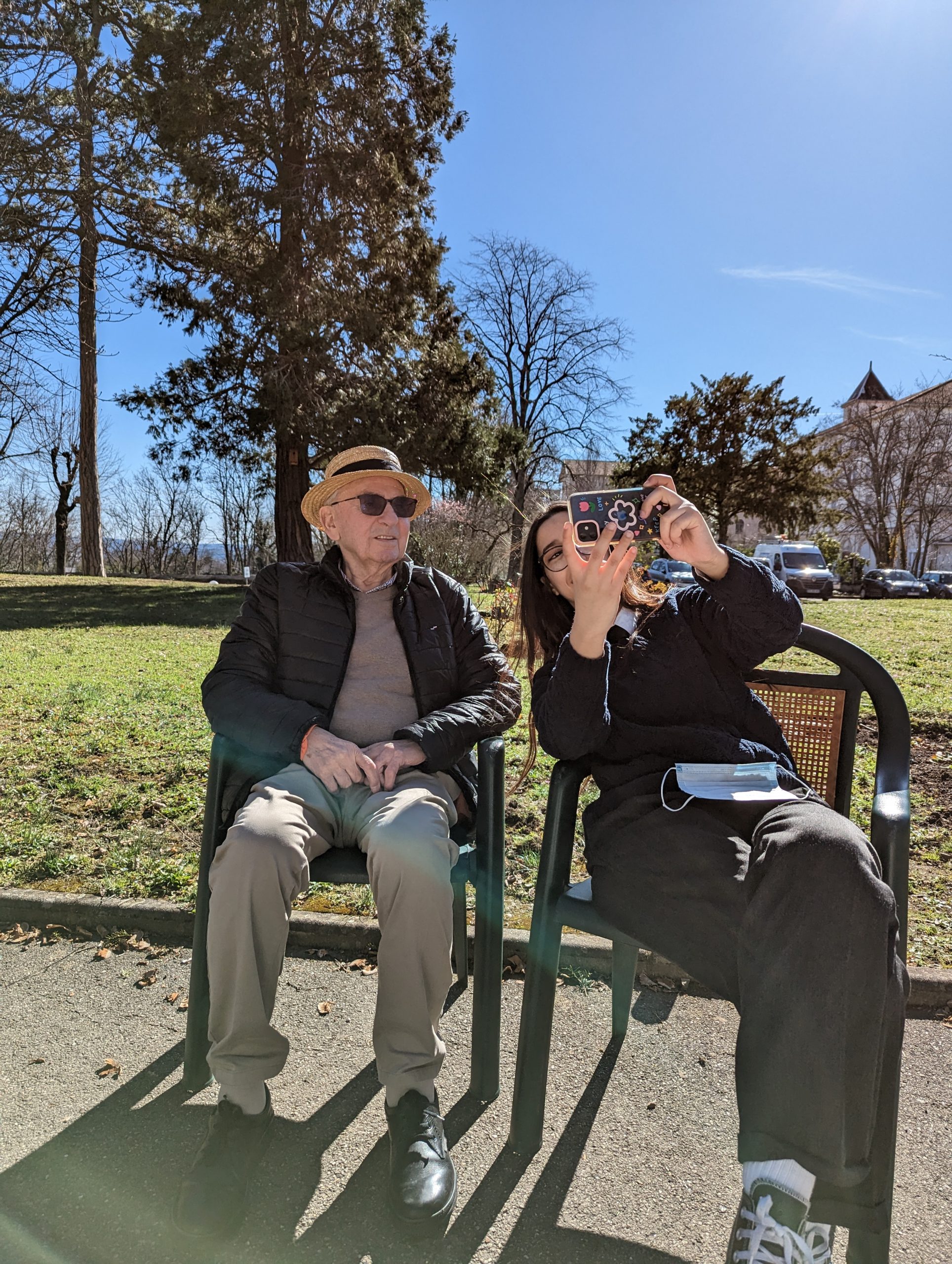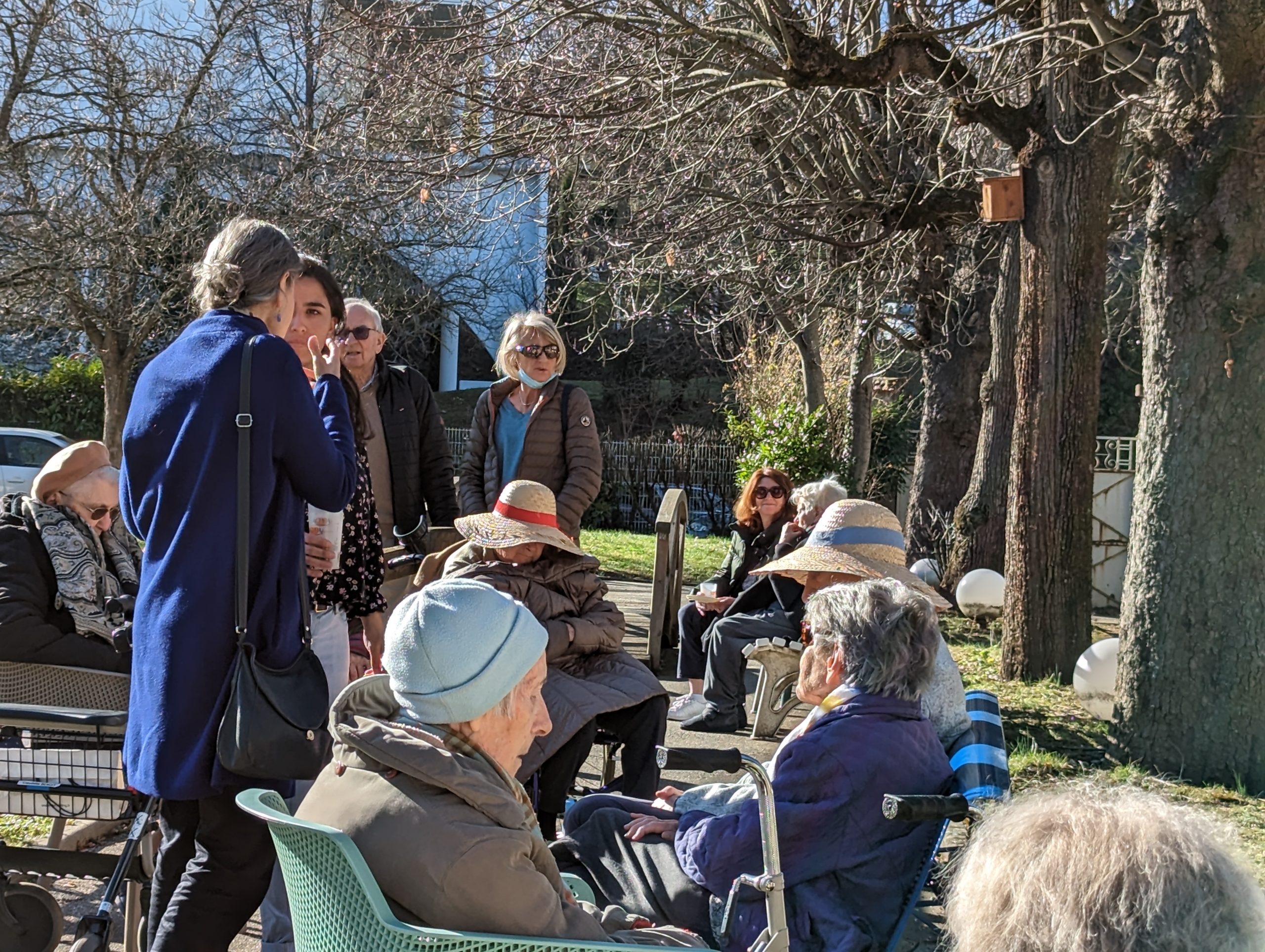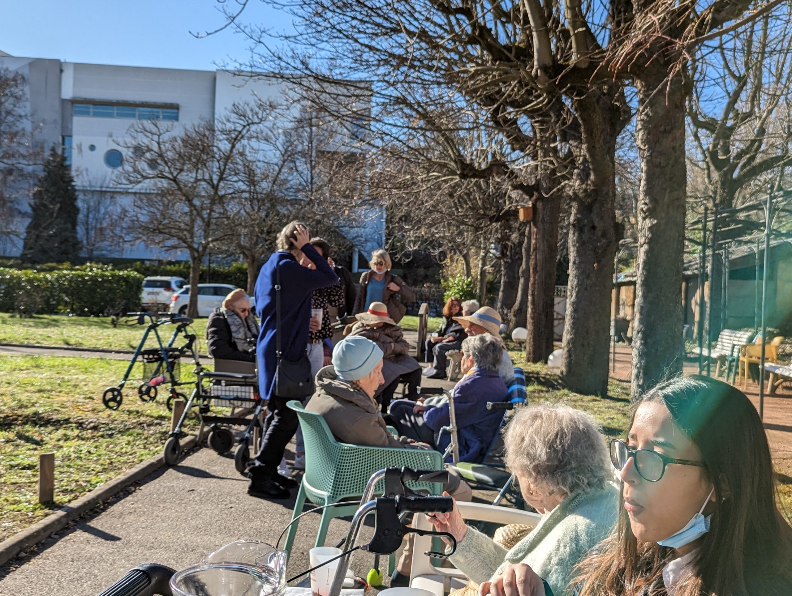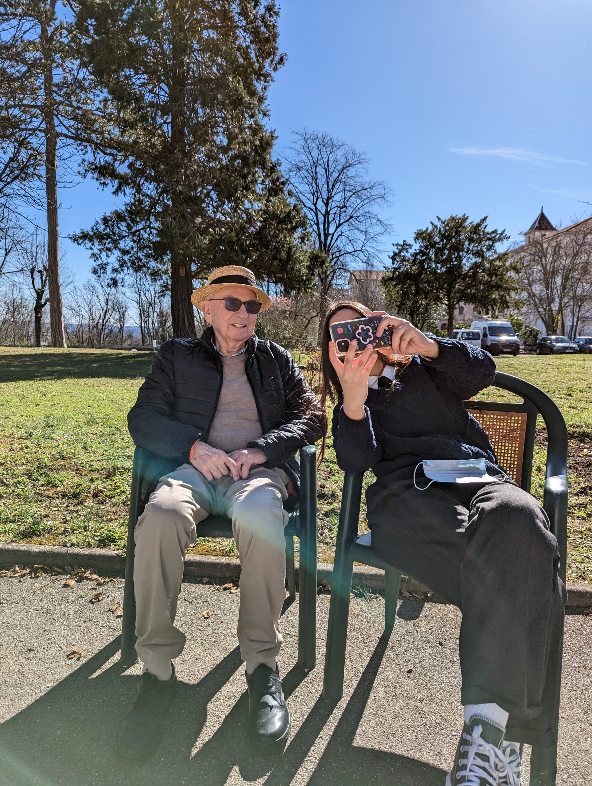 Chloé et Feyza en service civique aux Amandines profitent de l’arrivée des beaux jours pour proposer aux résidents de sortir dans le parc. Entre balade, discussion et jardinage, les résidents sont heureux de ces moments privilégiés qui leur permettent de prendre l’air.