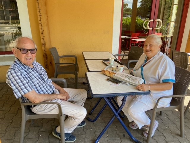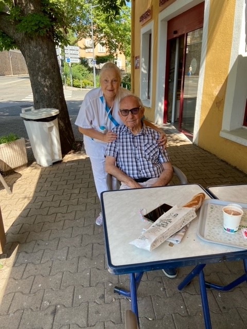 Elisabeth, AMP réalise des temps individuels avec de nombreux résidents. Tous les mercredis matin, elle accompagne un résident de l’UPDP acheter un pain et boire un café en terrasse. Ce petit moment en dehors de l’EHPAD est très apprécié.
