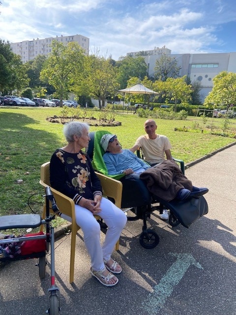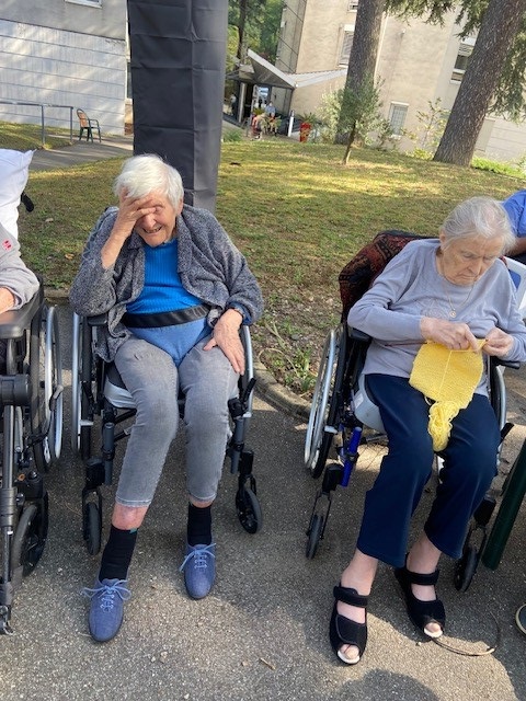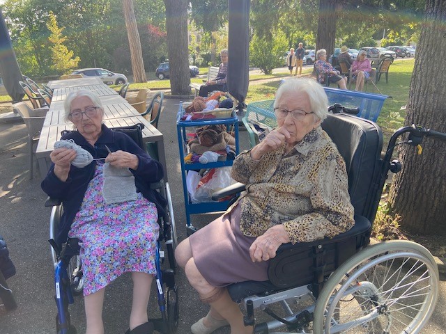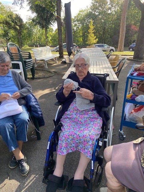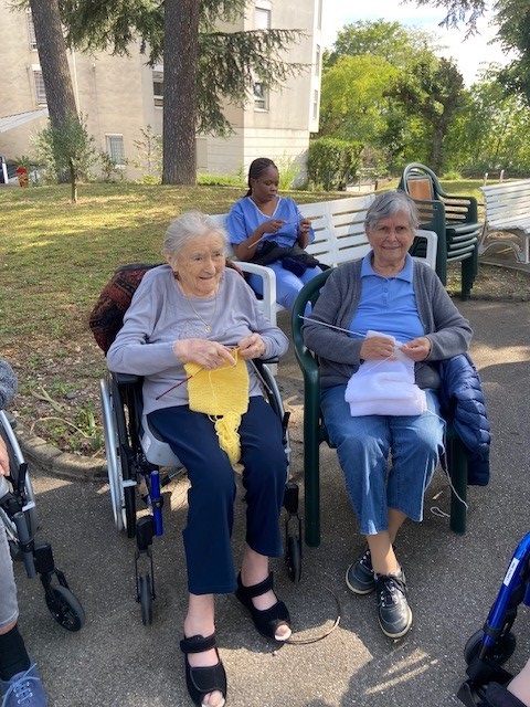 Beaucoup de résidentes tricotent. Ainsi, nous maintenons tous les vendredis après-midi l’atelier tricot dans le parc des Amandines si la météo le permet et dans le cas contraire dans notre salon Confluence. Une activité qui crée des échanges.