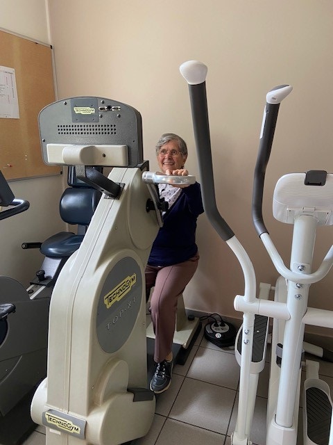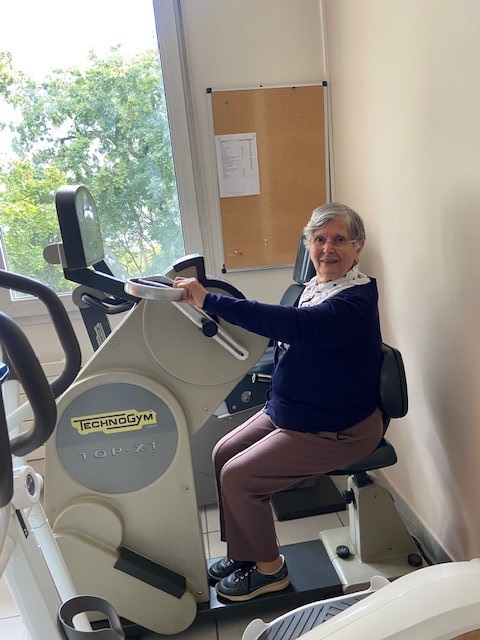 Dans le cadre de la Semaine Bleue, quelques résidents ont réalisé du vélo d’appartement dans la salle de rééducation sous le regard de l’animatrice.