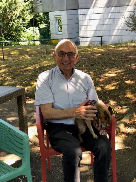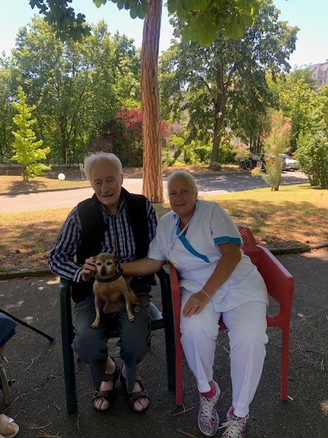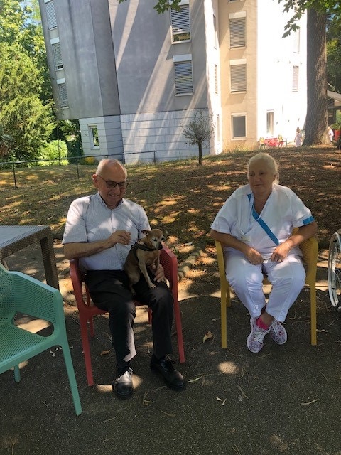 Notre chien masquotte Biscotte continue à rendre visite aux résidents cet été pour le bonheur de tous.