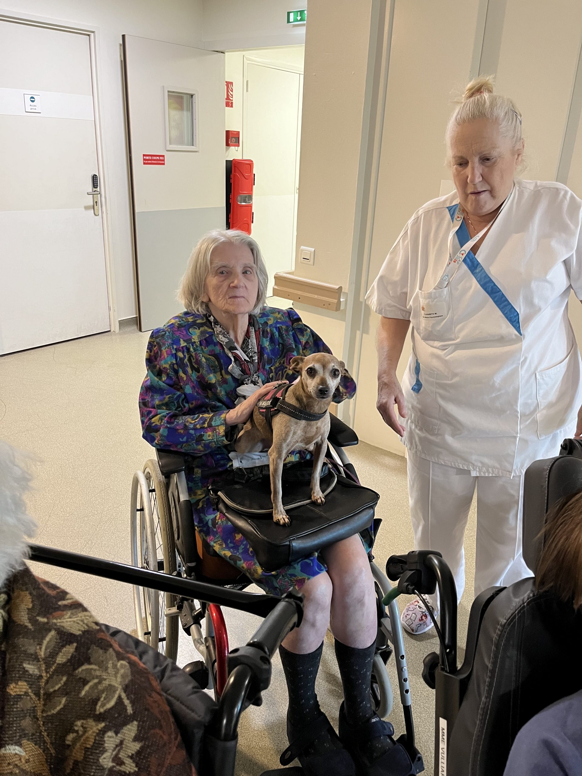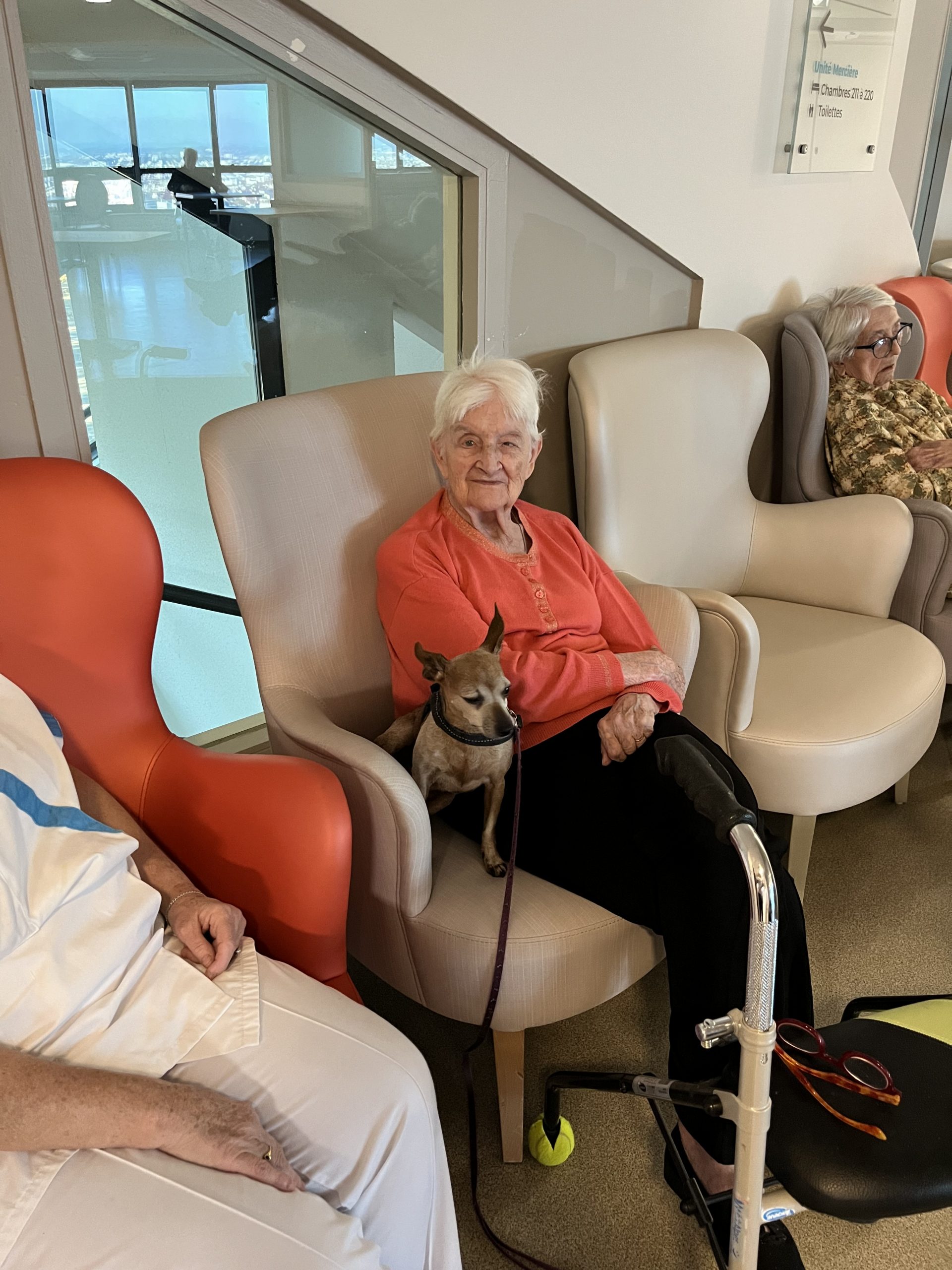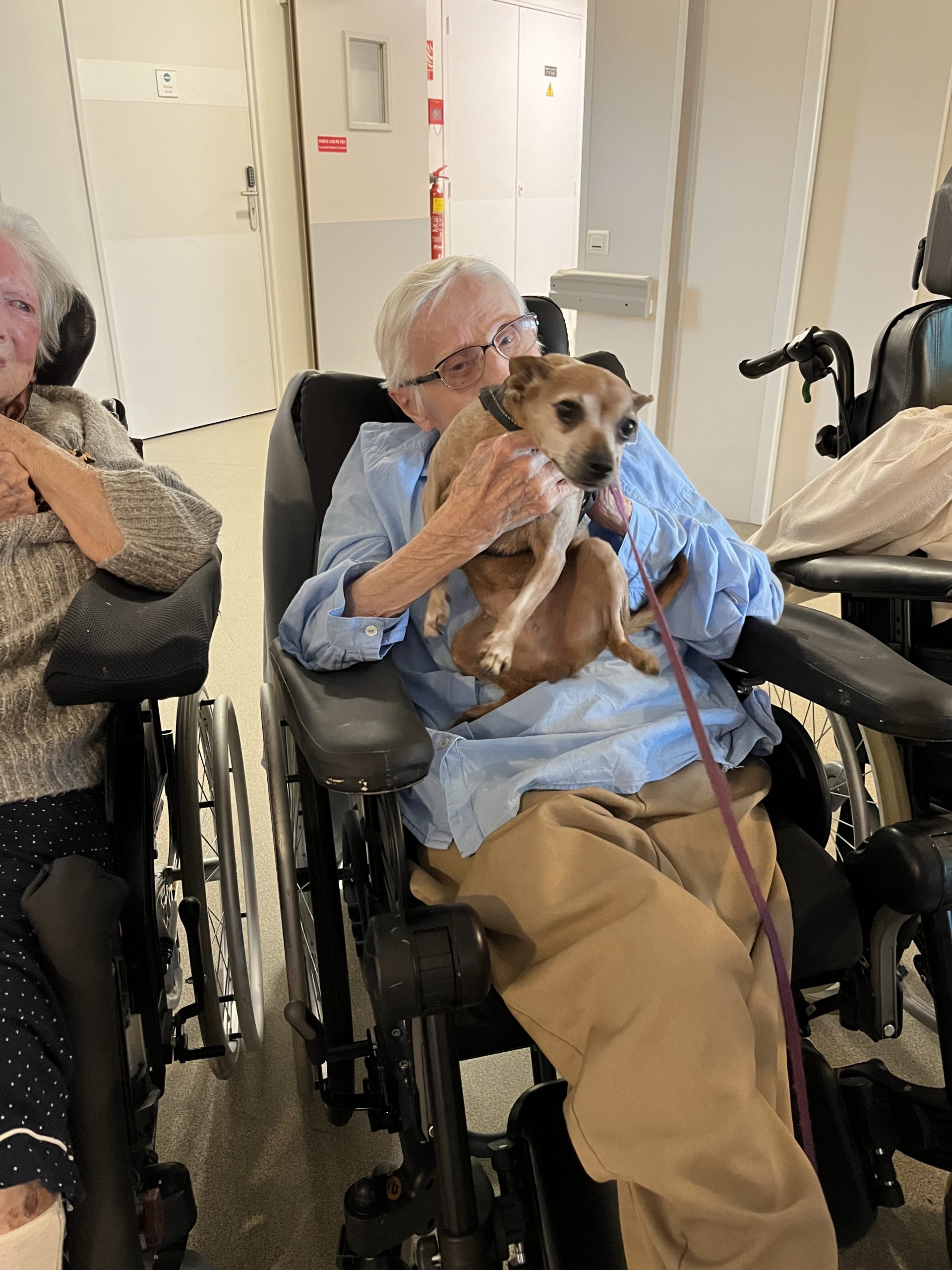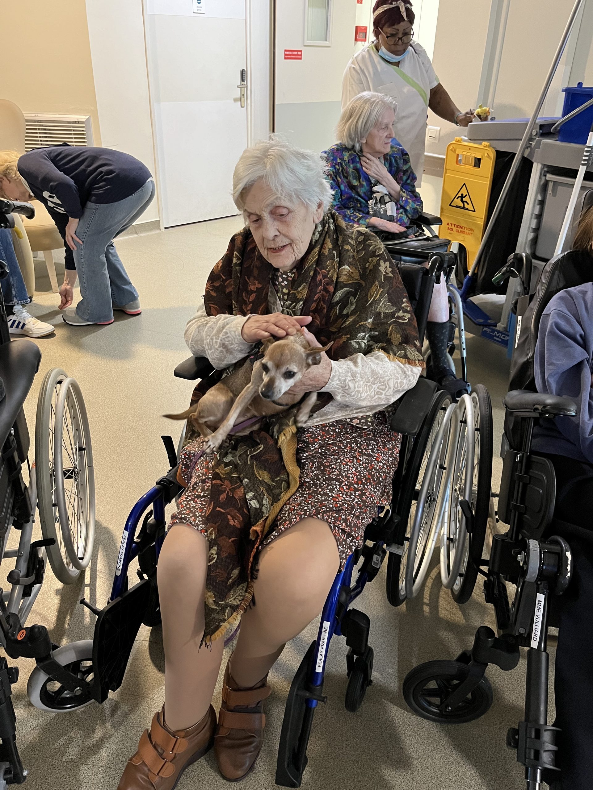 Elisabeth amène sa chienne Biscotte un jeudi par mois. Les résidents sont contents de la revoir à chaque fois et profitent de ces moments apaisant pour caresser le petit animal. Elisabeth passe dans chaque étage pour échanger et passer un moment avec les résidents qui le souhaitent puis fini la journée au salon Confluence pour en faire profiter aux familles et résidents présents.