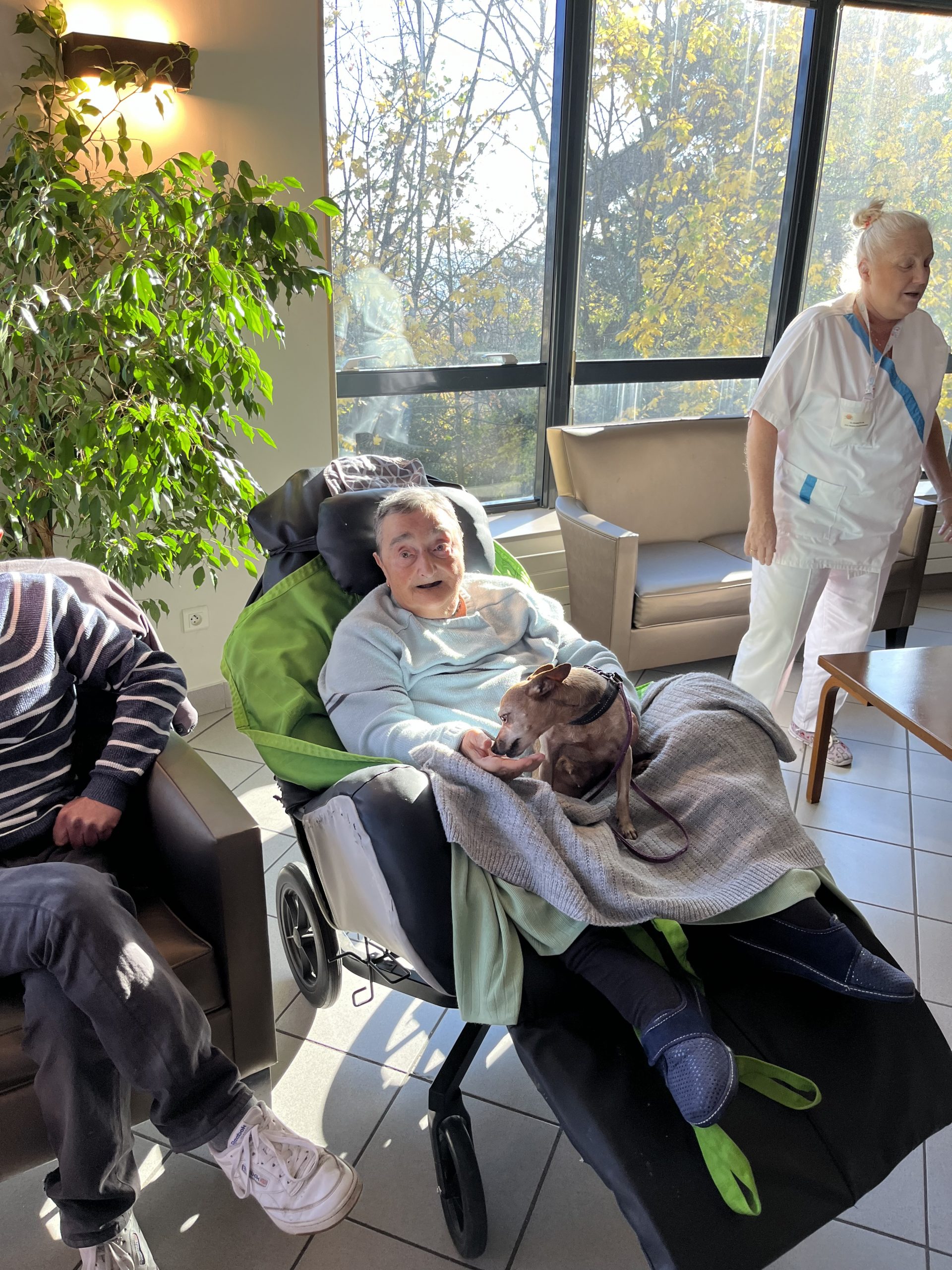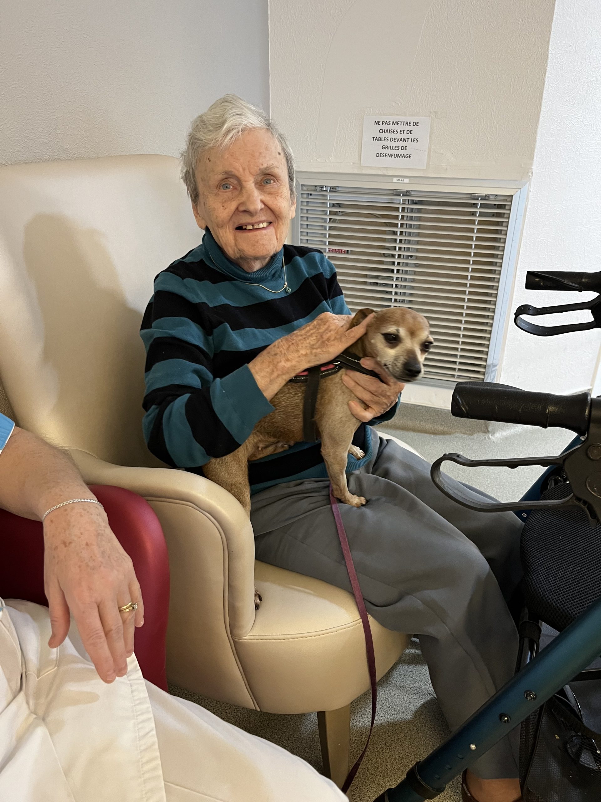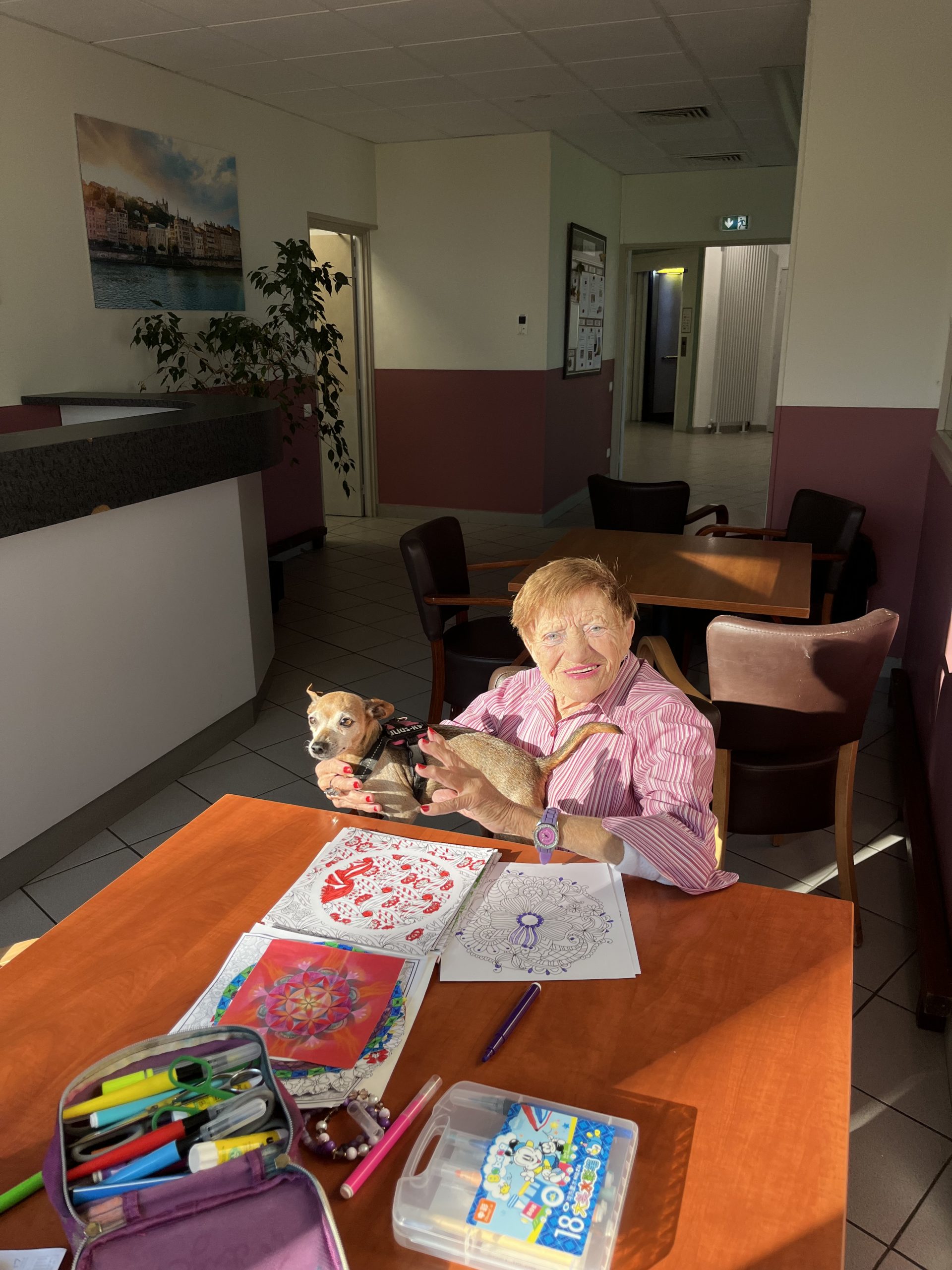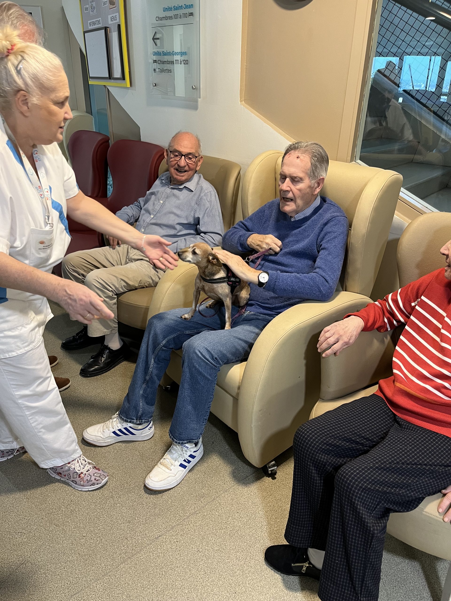 Elisabeth amène sa chienne Biscotte un jeudi par mois. Les résidents sont contents de la revoir à chaque fois et profitent de ces moments apaisant pour caresser le petit animal. Elisabeth passe dans chaque étage pour échanger et passer un moment avec les résidents qui le souhaitent puis fini la journée au salon Confluence pour en faire profiter aux familles et résidents présents.