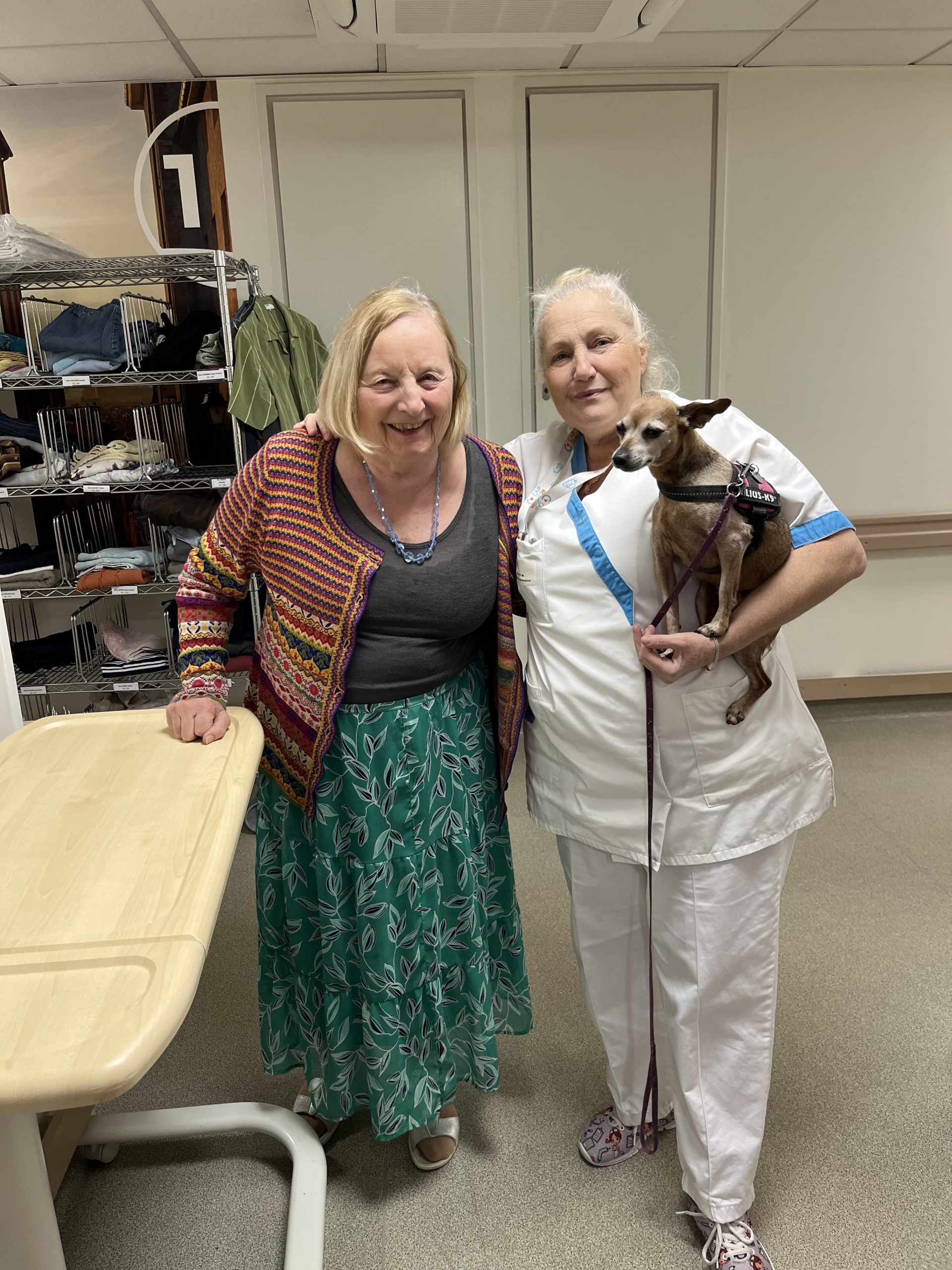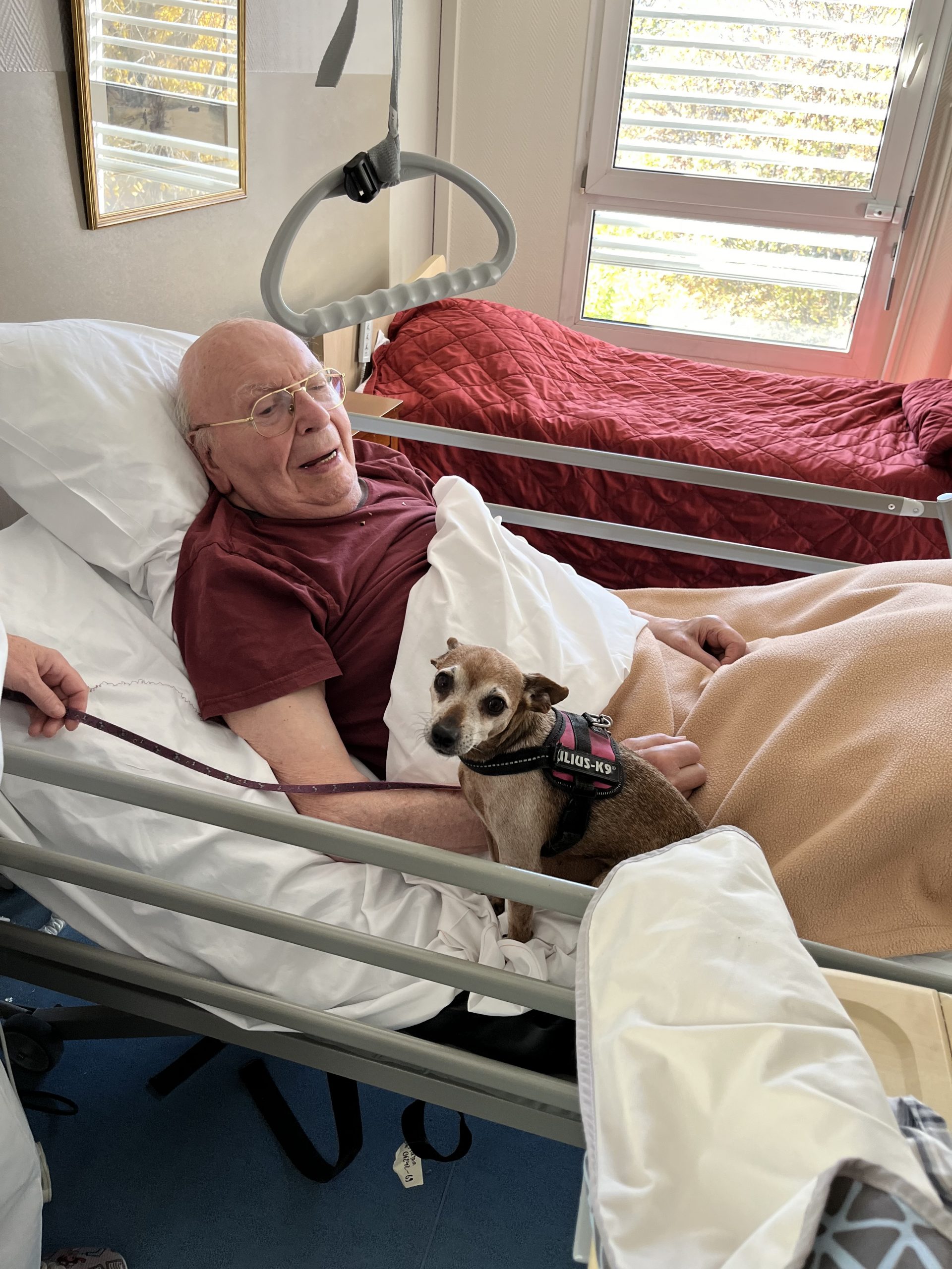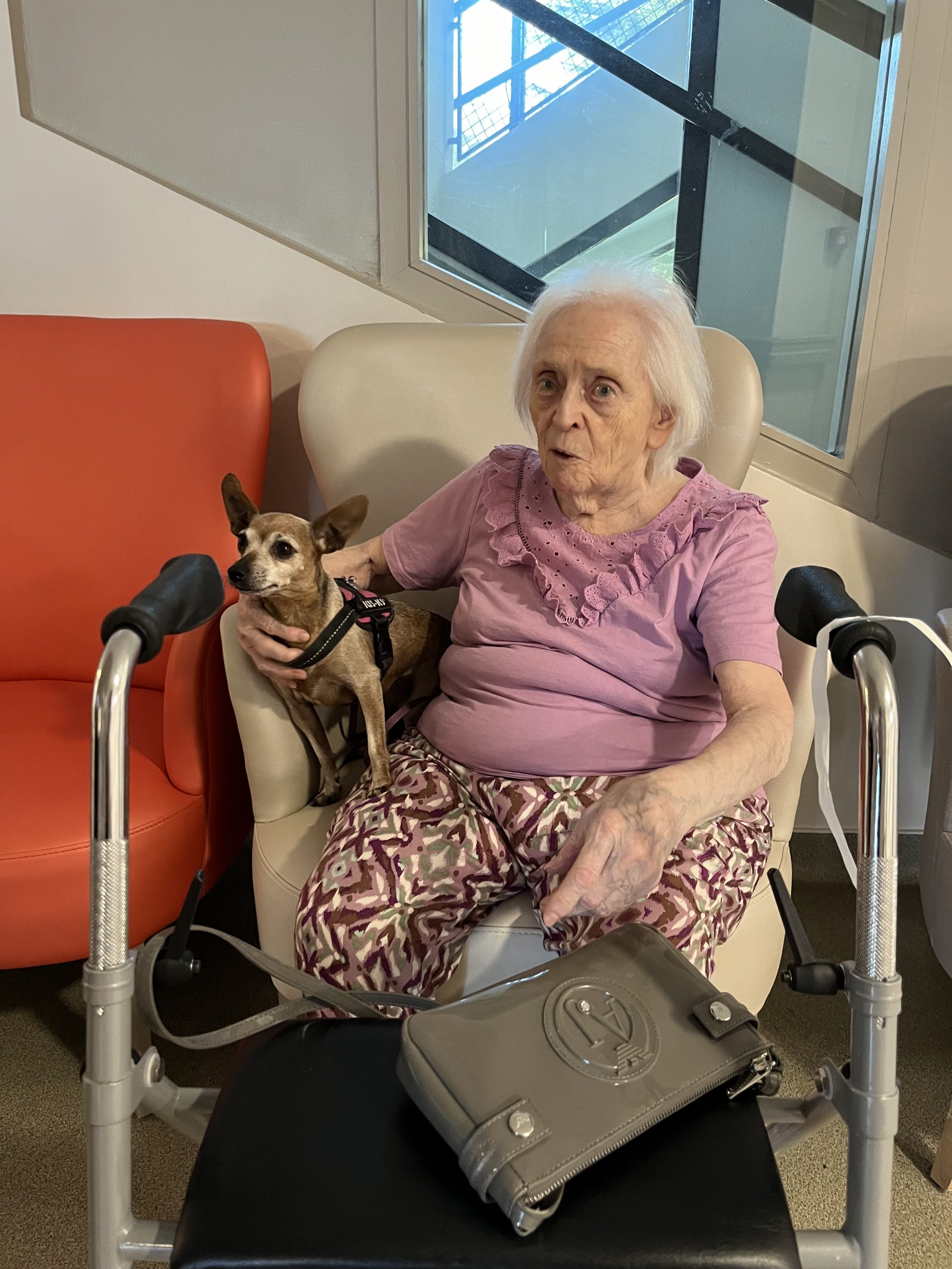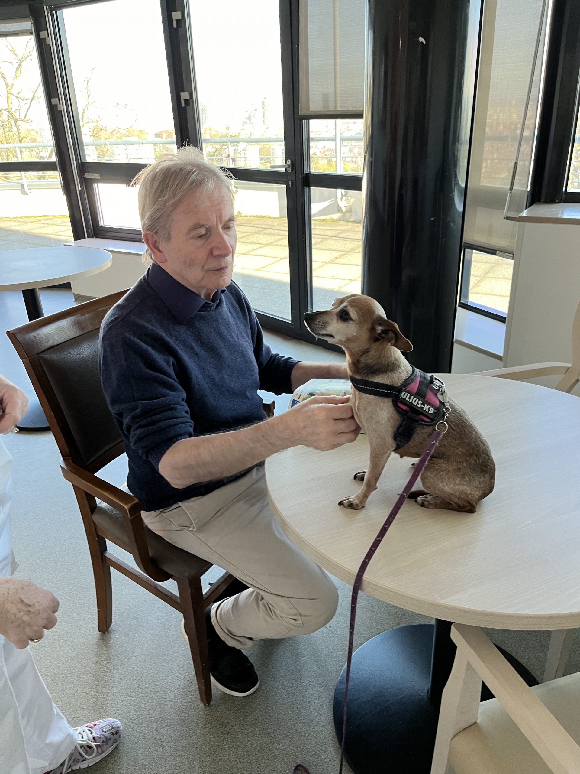 Elisabeth amène sa chienne Biscotte un jeudi par mois. Les résidents sont contents de la revoir à chaque fois et profitent de ces moments apaisant pour caresser le petit animal. Elisabeth passe dans chaque étage pour échanger et passer un moment avec les résidents qui le souhaitent puis fini la journée au salon Confluence pour en faire profiter aux familles et résidents présents.