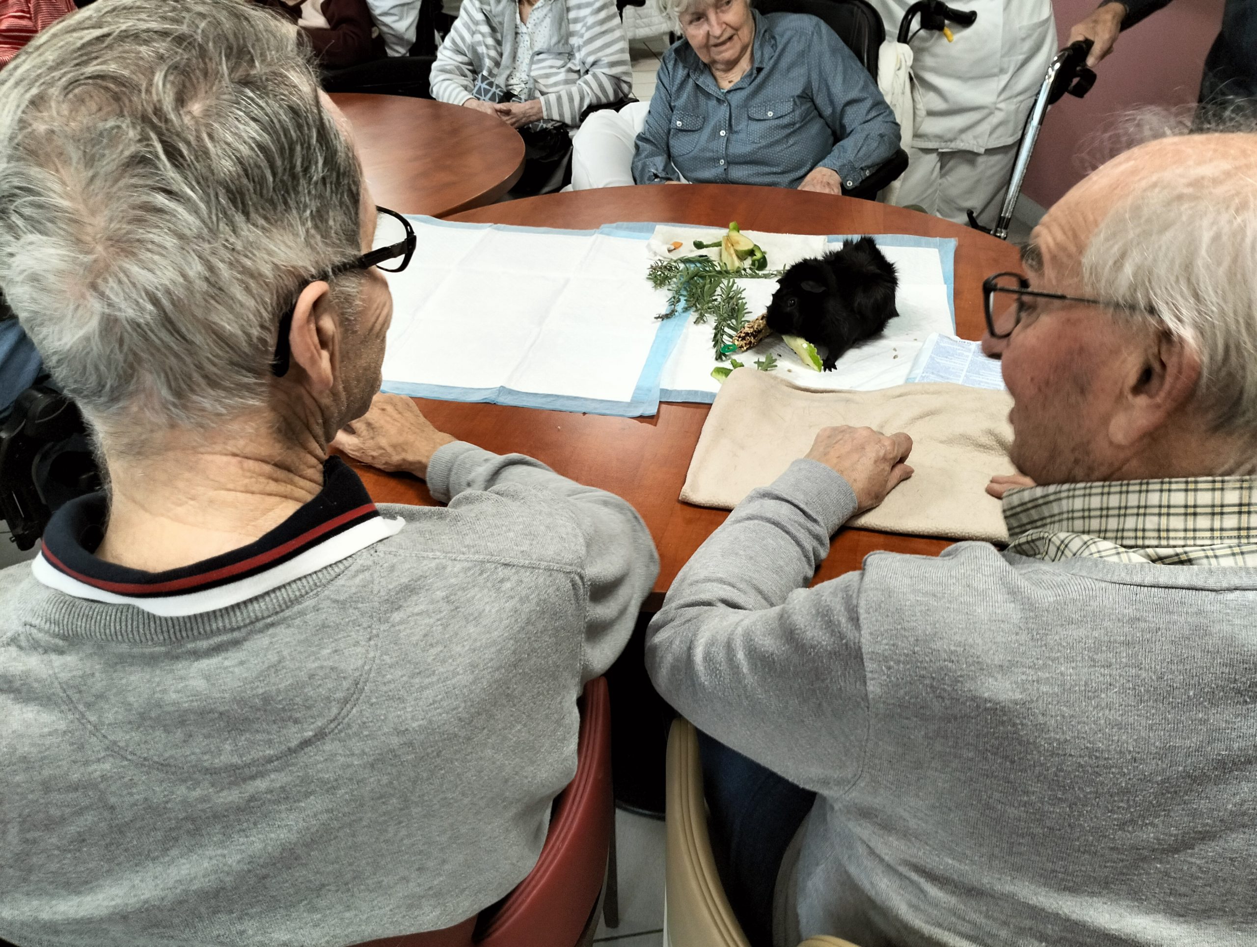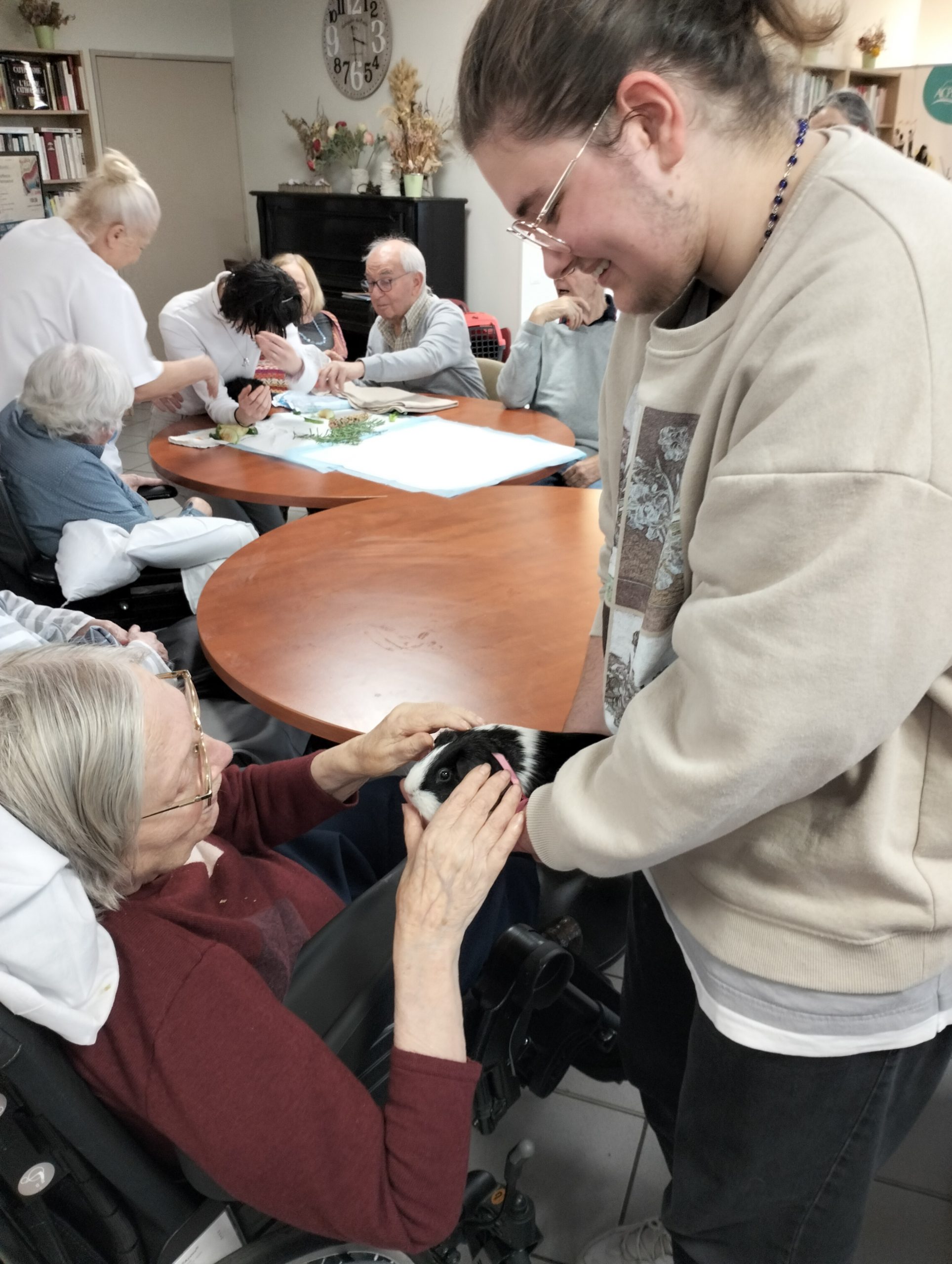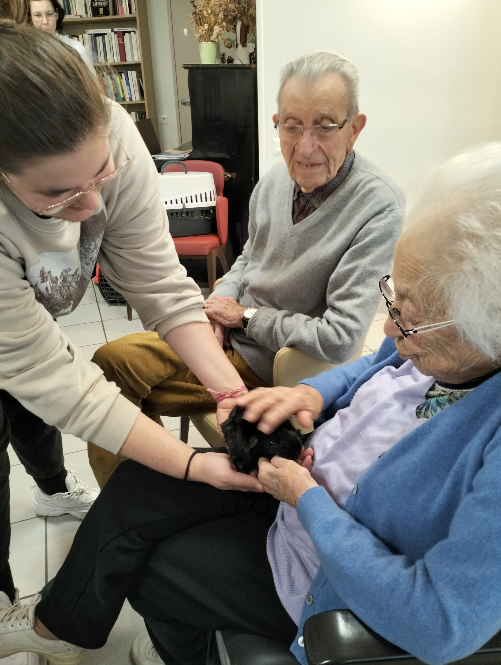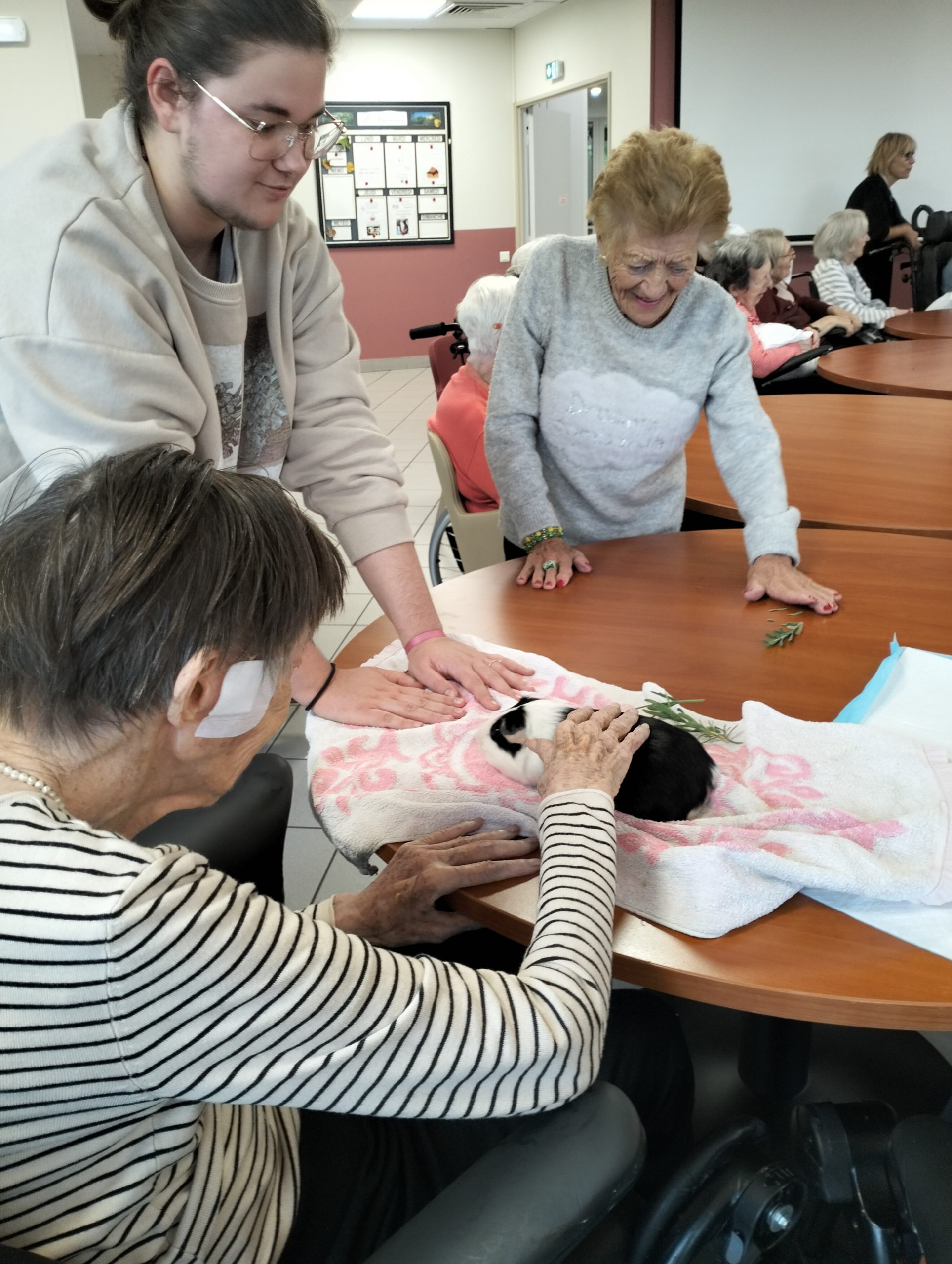 Vendredi 10 novembre, les résidents ont pu profiter d’un après-midi en compagnie de quatre cochons d’inde. Les animaux ont été apportés par Arthur en service civique aux Amandines. Au programme, caresses, découverte des animaux et jeux. Les résidents ont beaucoup apprécié découvrir ces petites bêtes. Merci à Arthur pour son implication et ses idées innovantes.