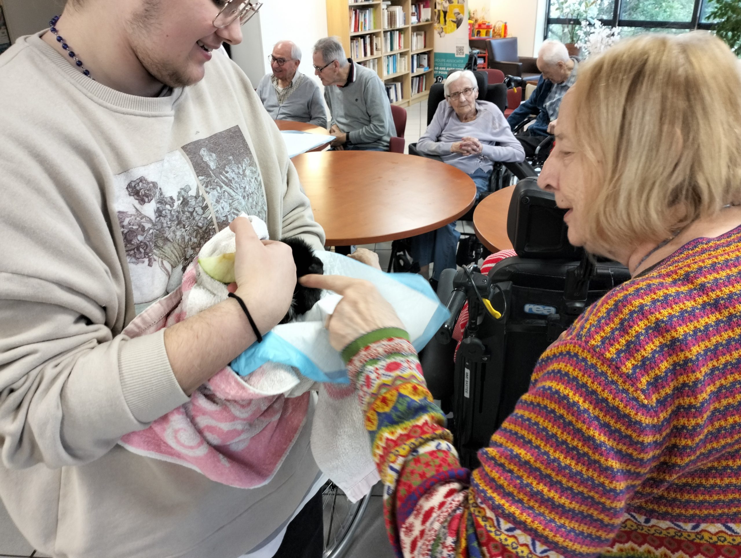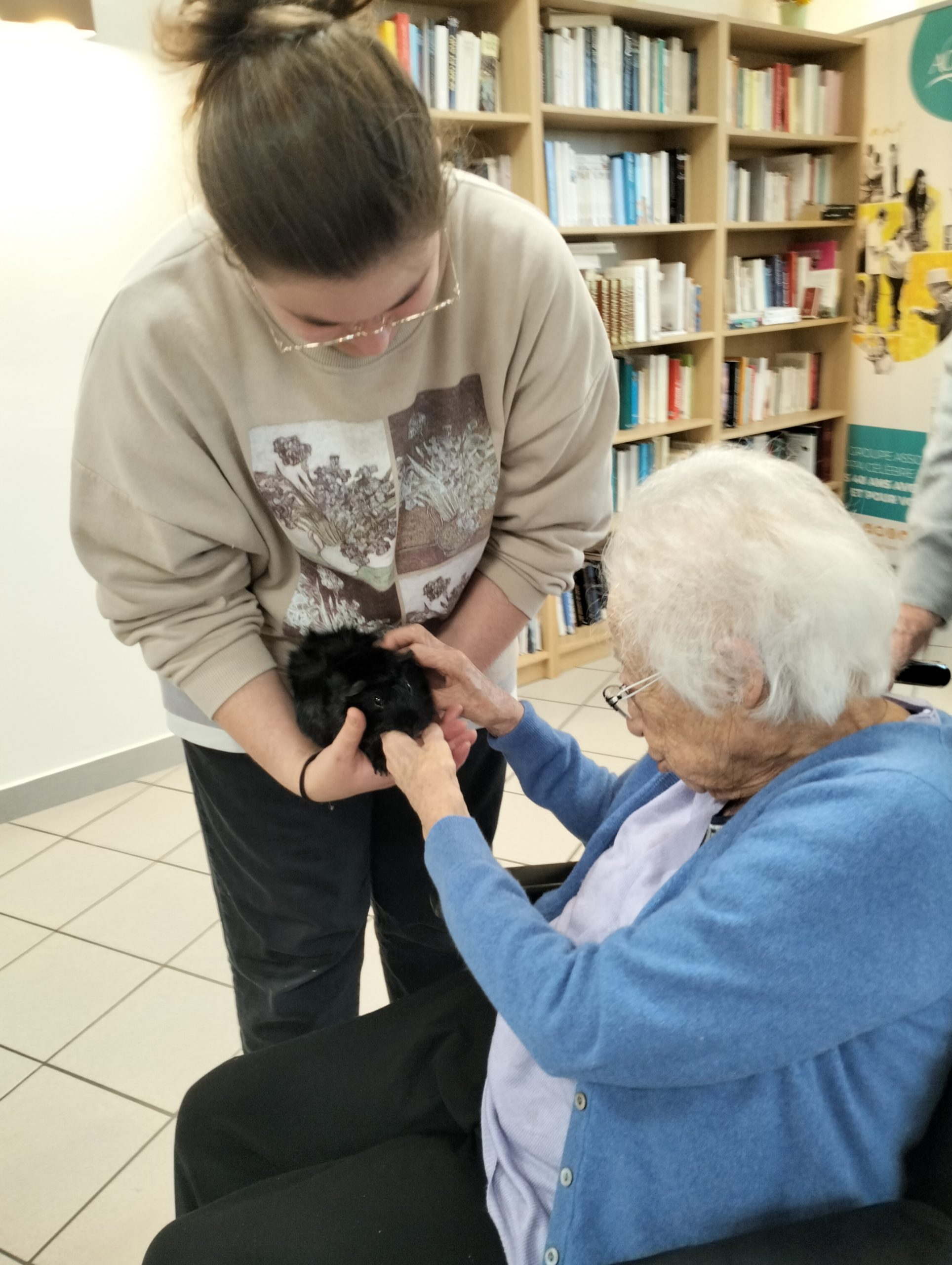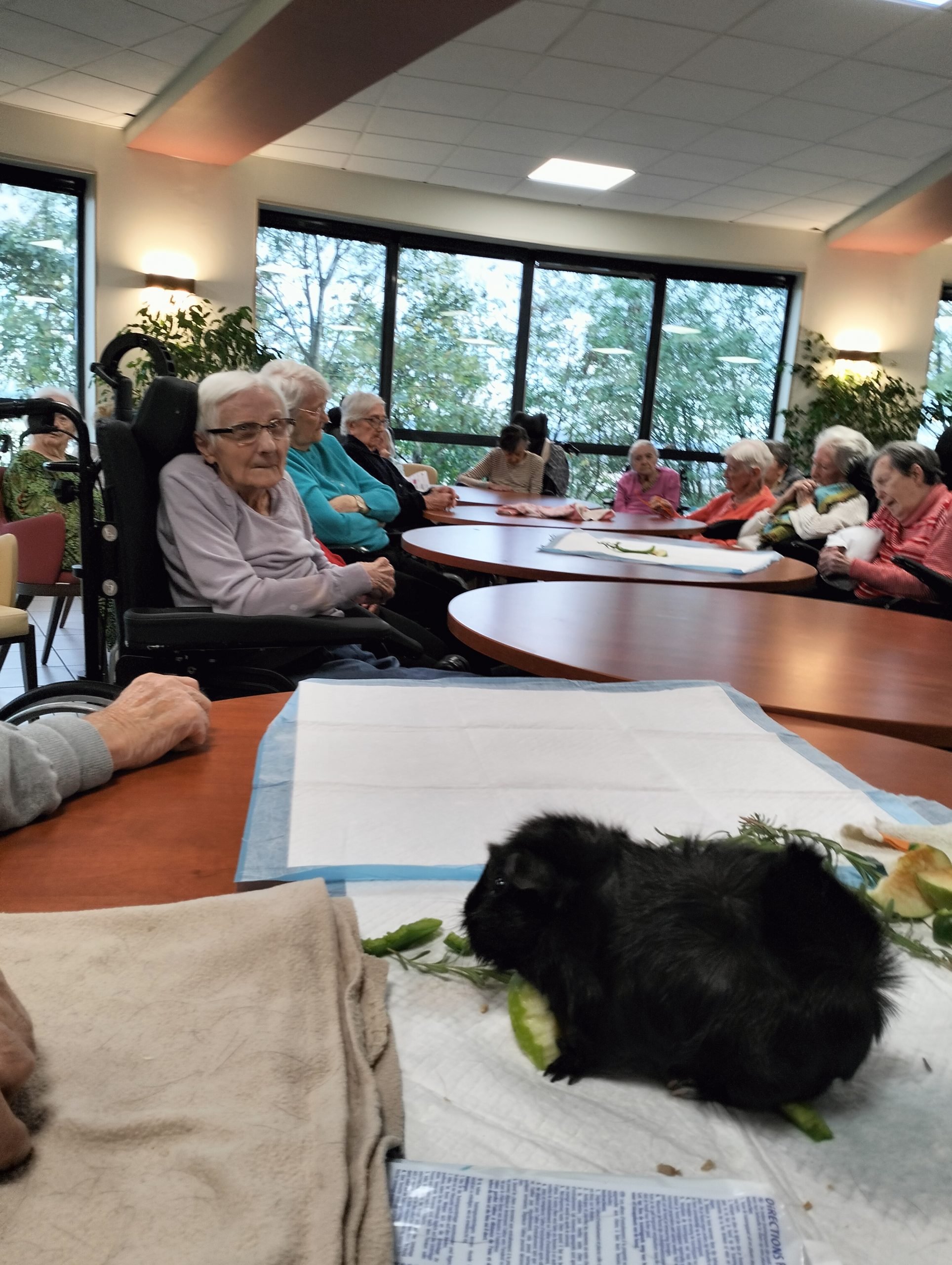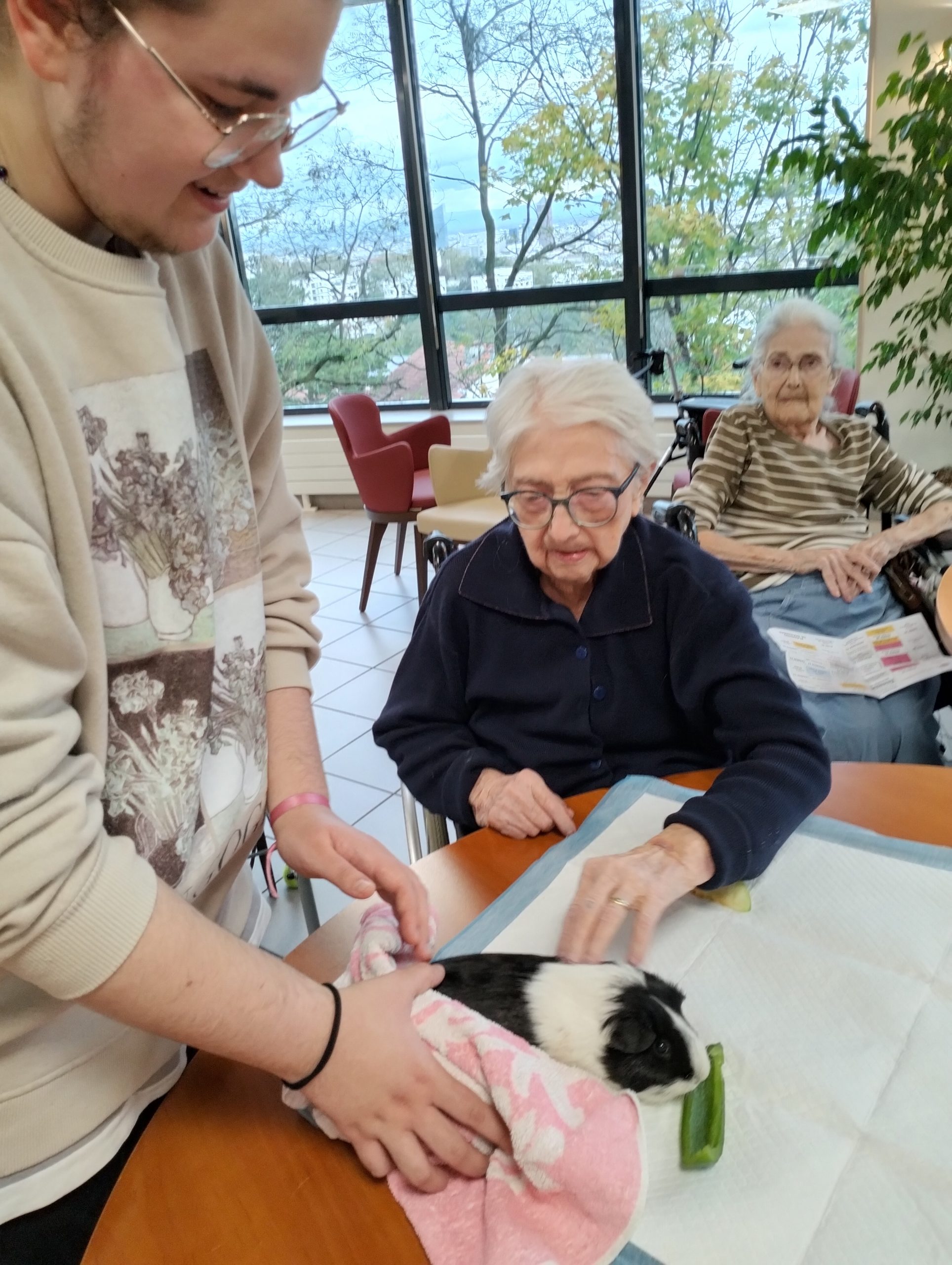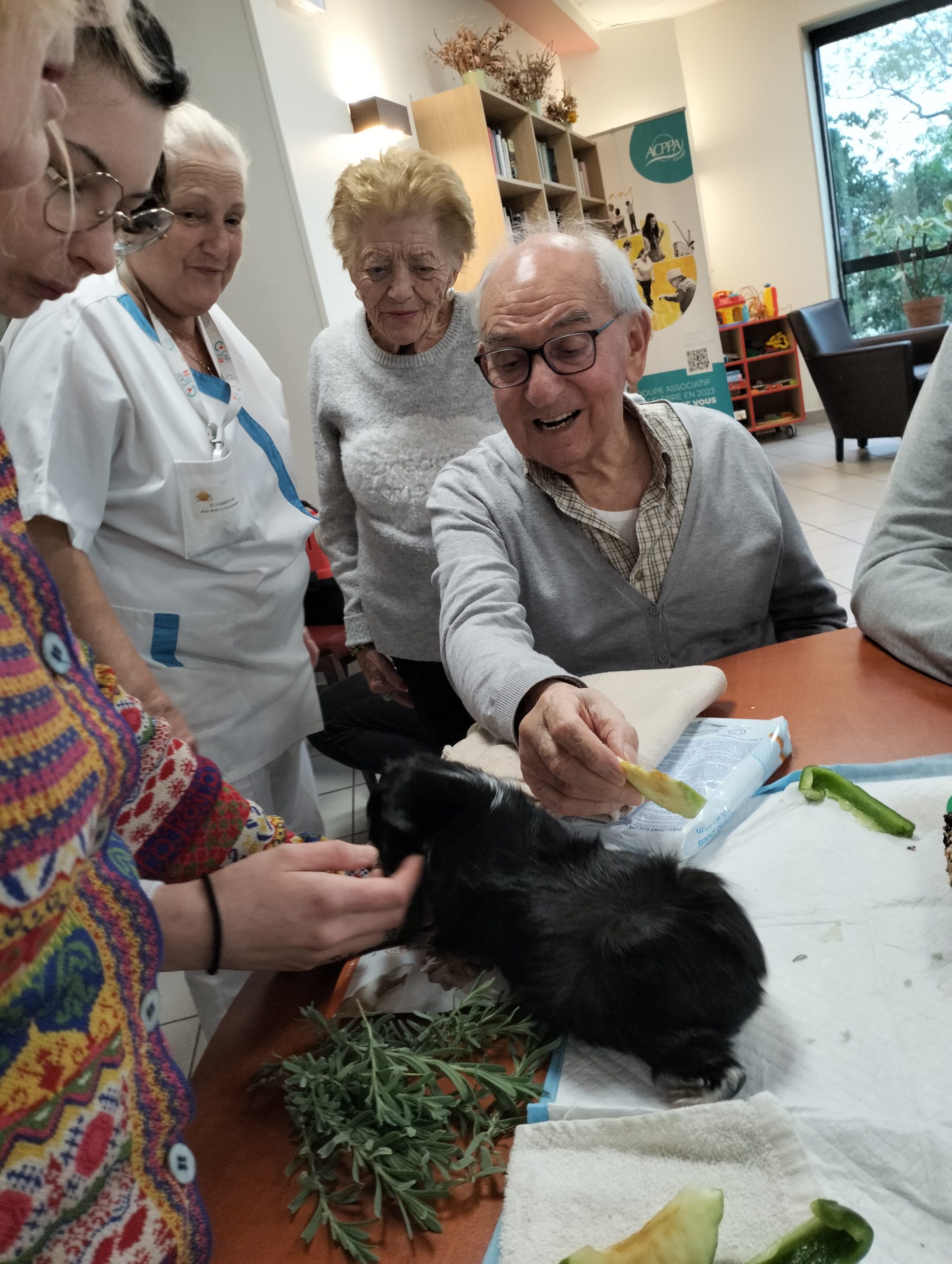 Vendredi 10 novembre, les résidents ont pu profiter d’un après-midi en compagnie de quatre cochons d’inde. Les animaux ont été apportés par Arthur en service civique aux Amandines. Au programme, caresses, découverte des animaux et jeux. Les résidents ont beaucoup apprécié découvrir ces petites bêtes. Merci à Arthur pour son implication et ses idées innovantes.