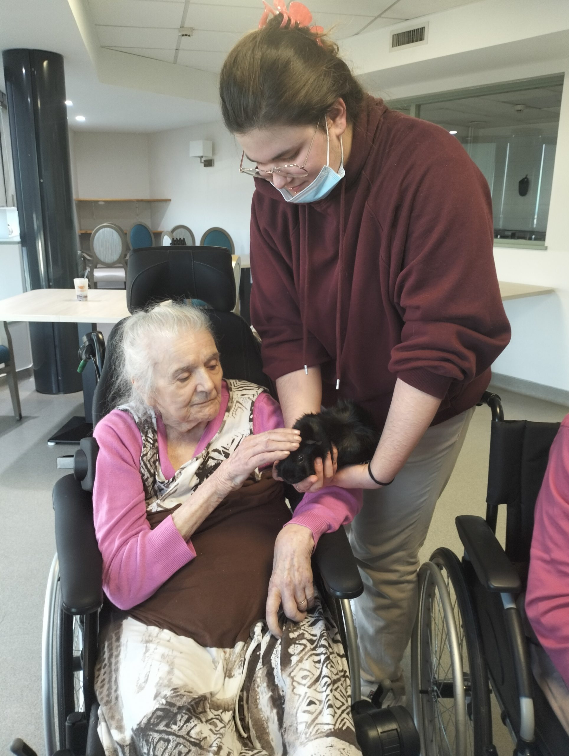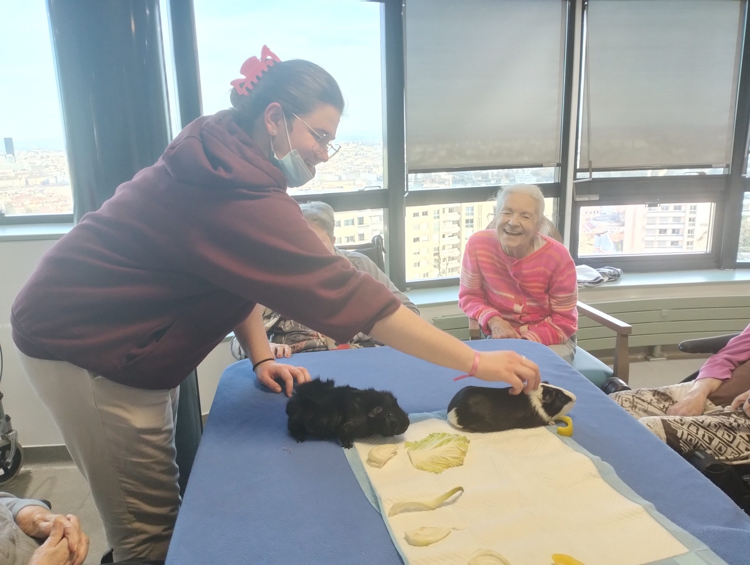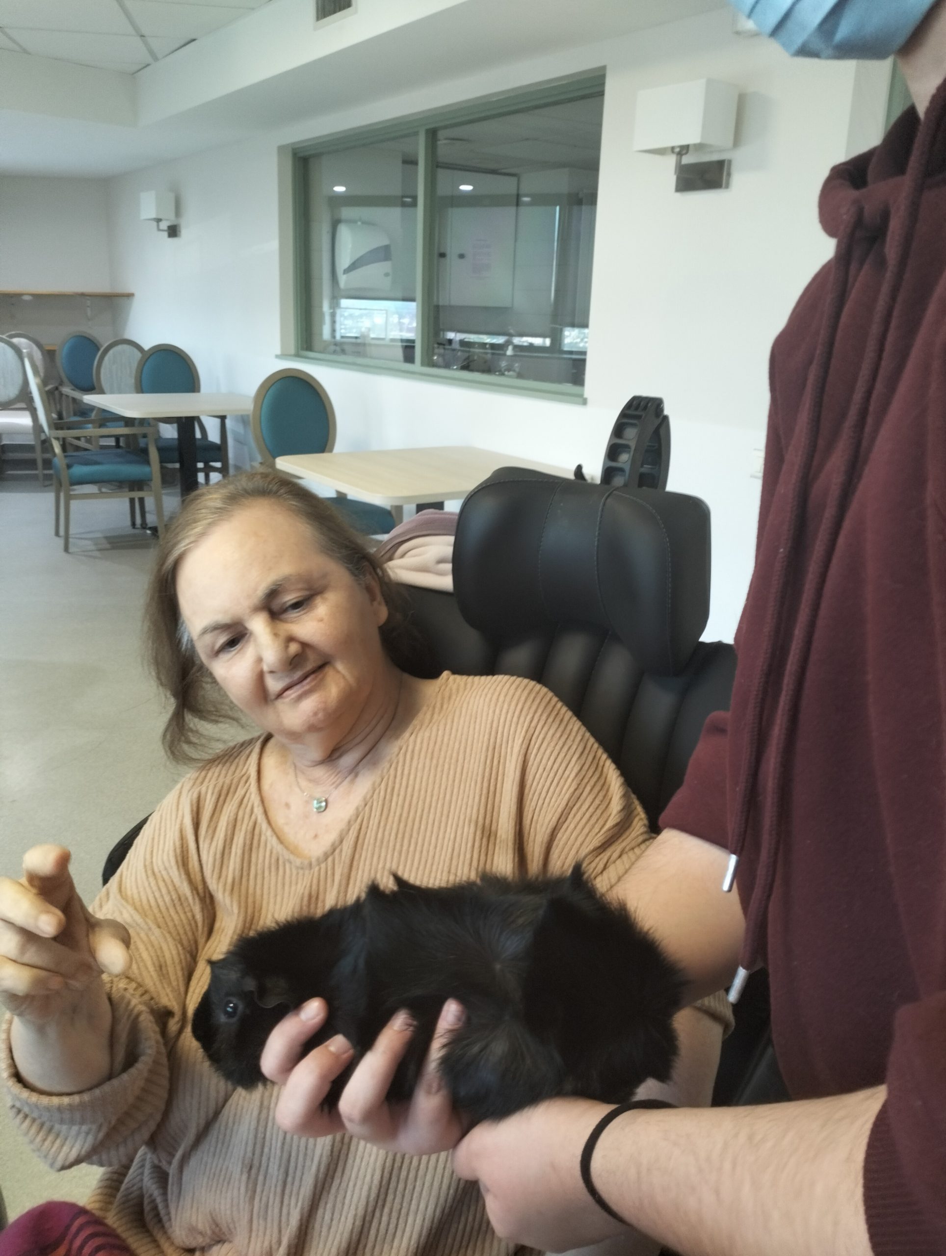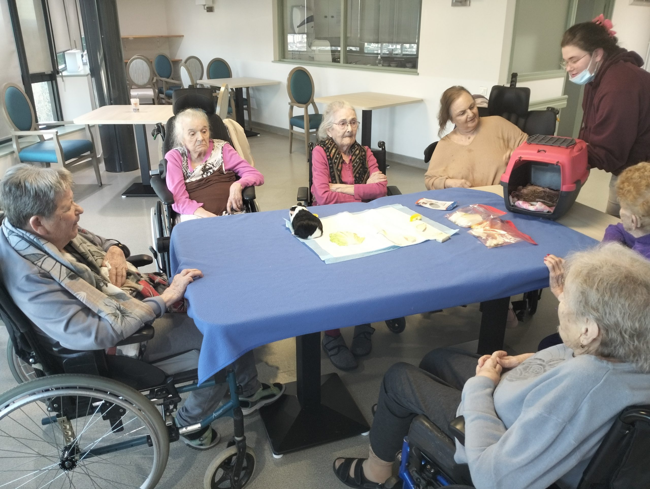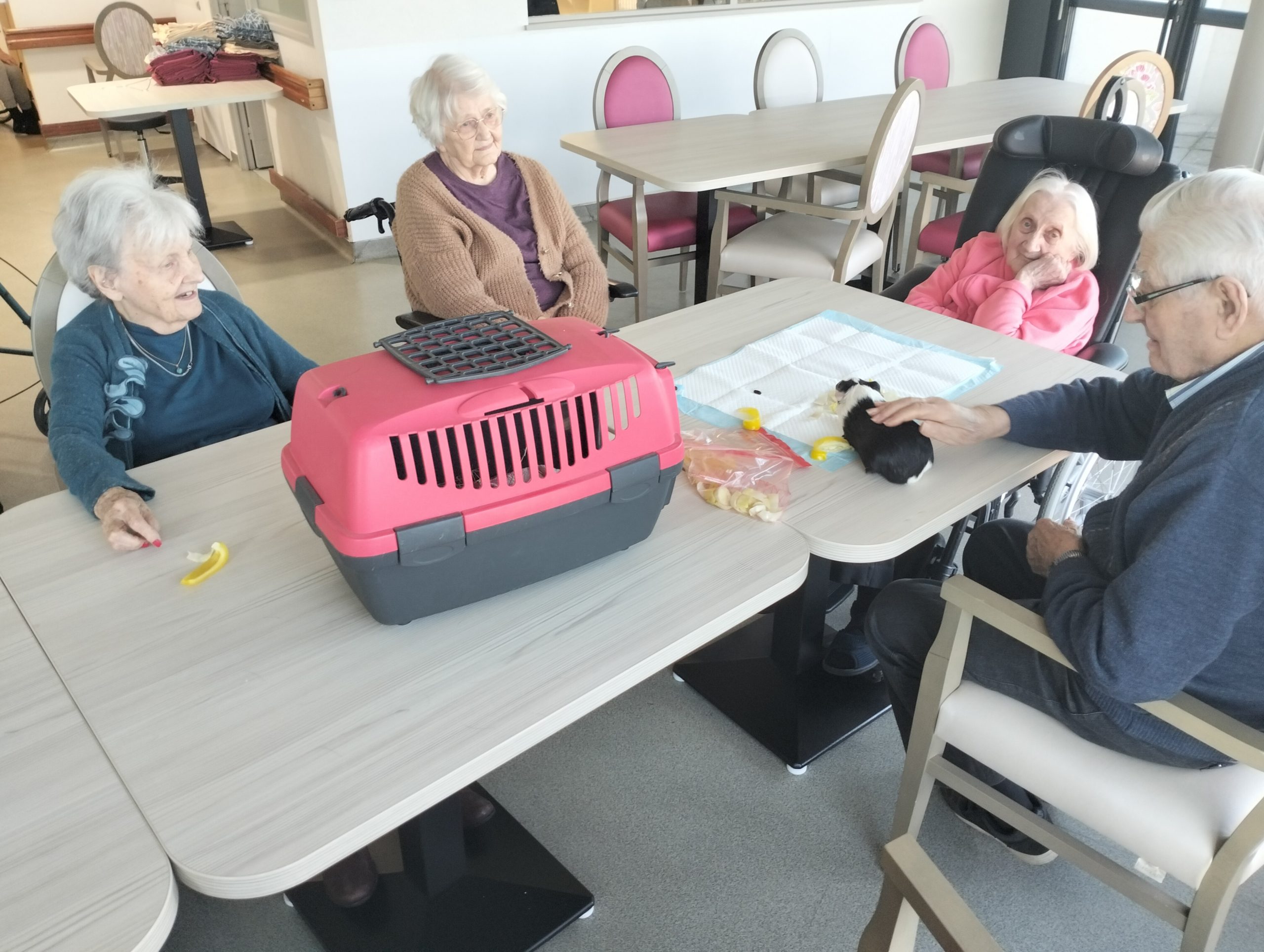 Artur en service civique aux Amandines est venu avec ses deux cochons d’inde le lundi 29 janvier. Il est passé dans chaque étage pour présenter ses petites bêtes. Les résidents intrigués et contents ont pu profiter de ce moment calme pour caresser ces animaux et discuter avec Arthur. Entre rires, surprises et moments de tendresse, les résidents profitent de ces temps de médiation animale pour se changer les idées. Merci à Arthur pour sa bienveillance.