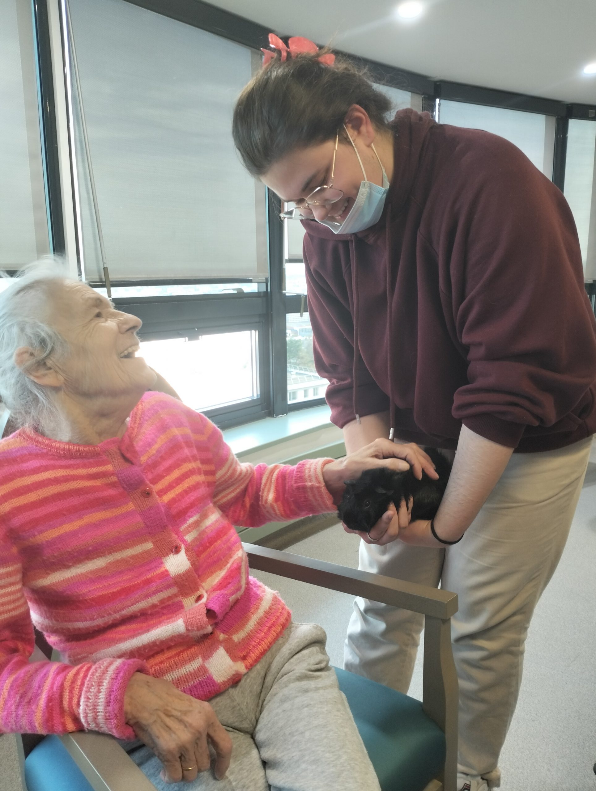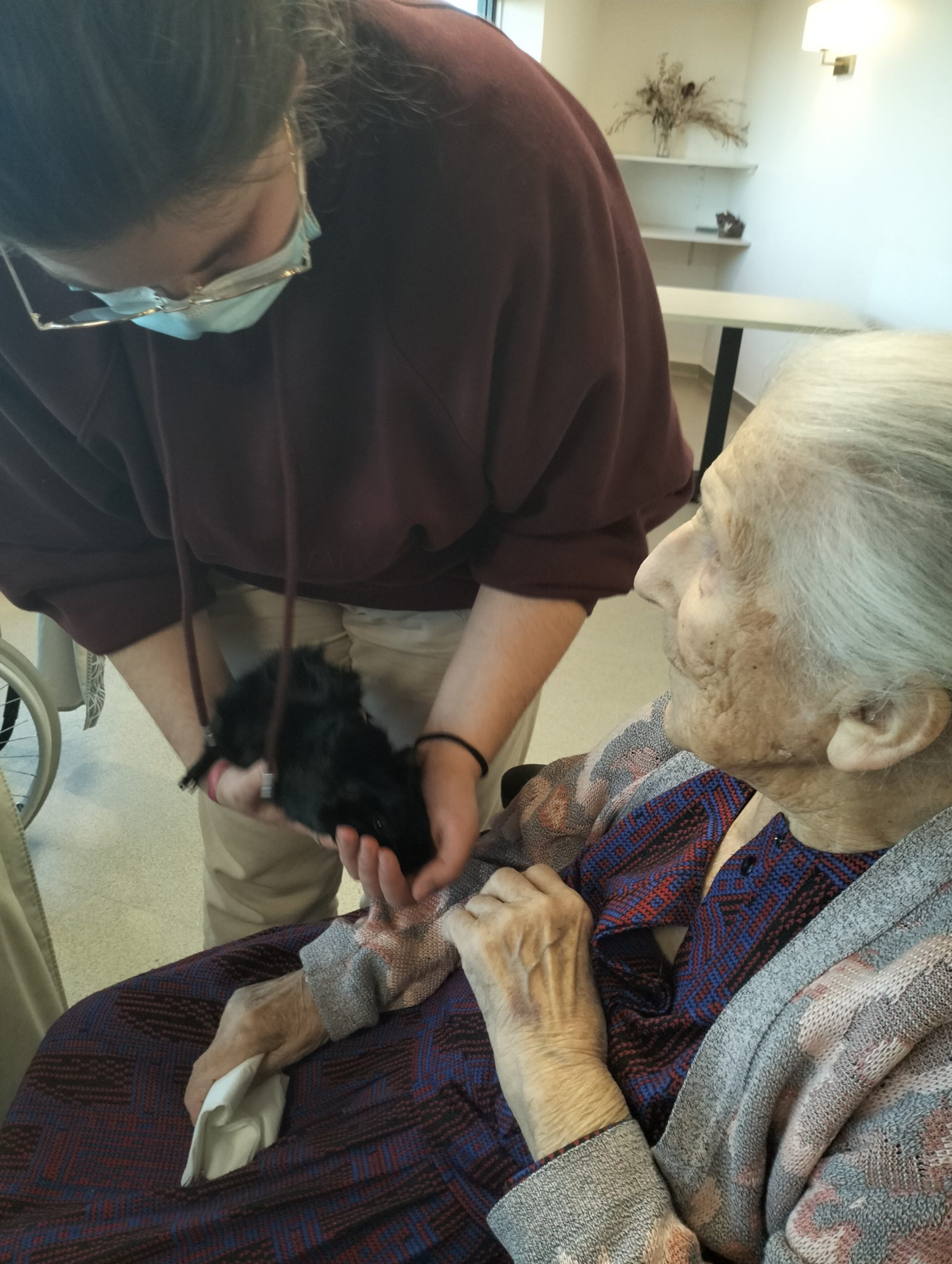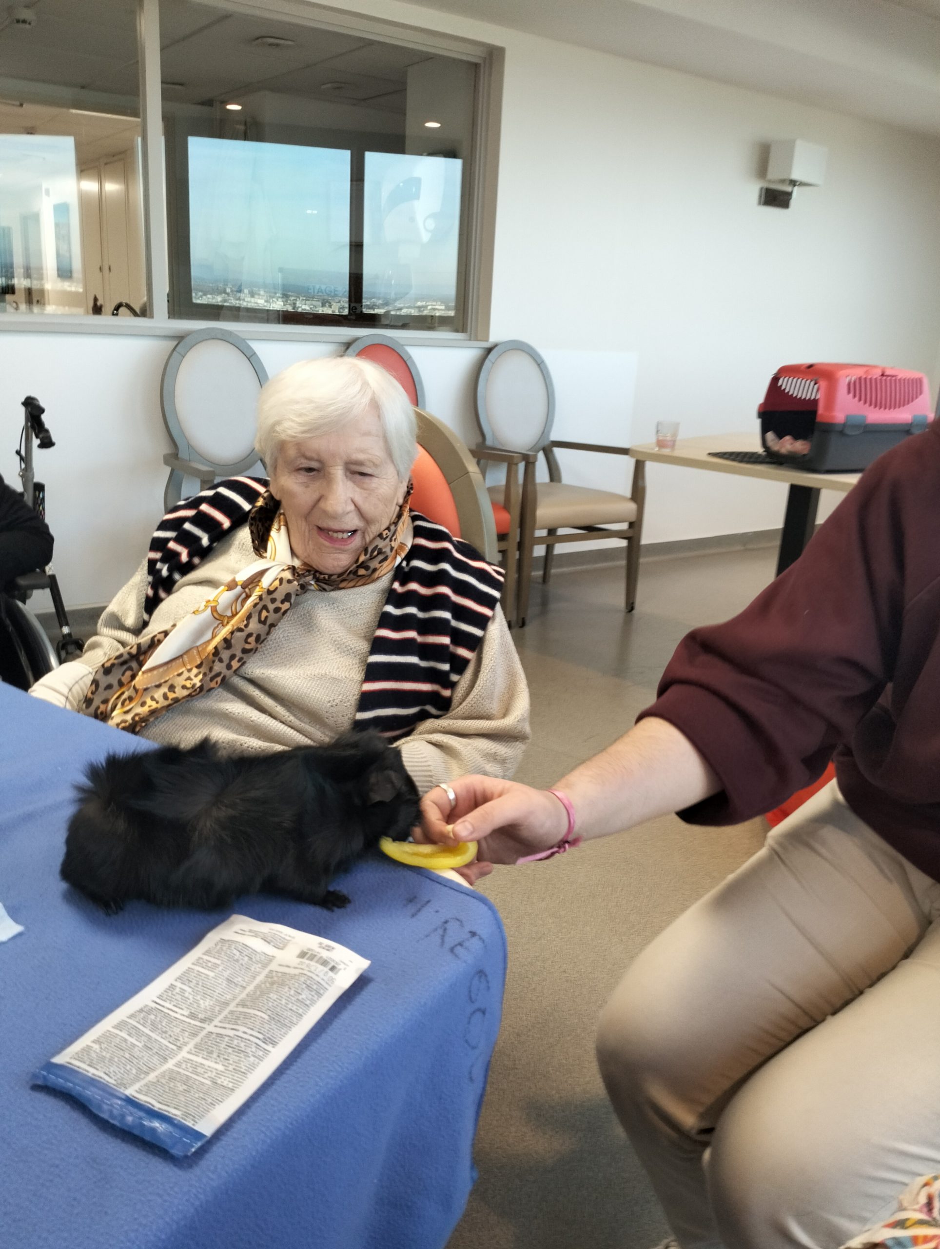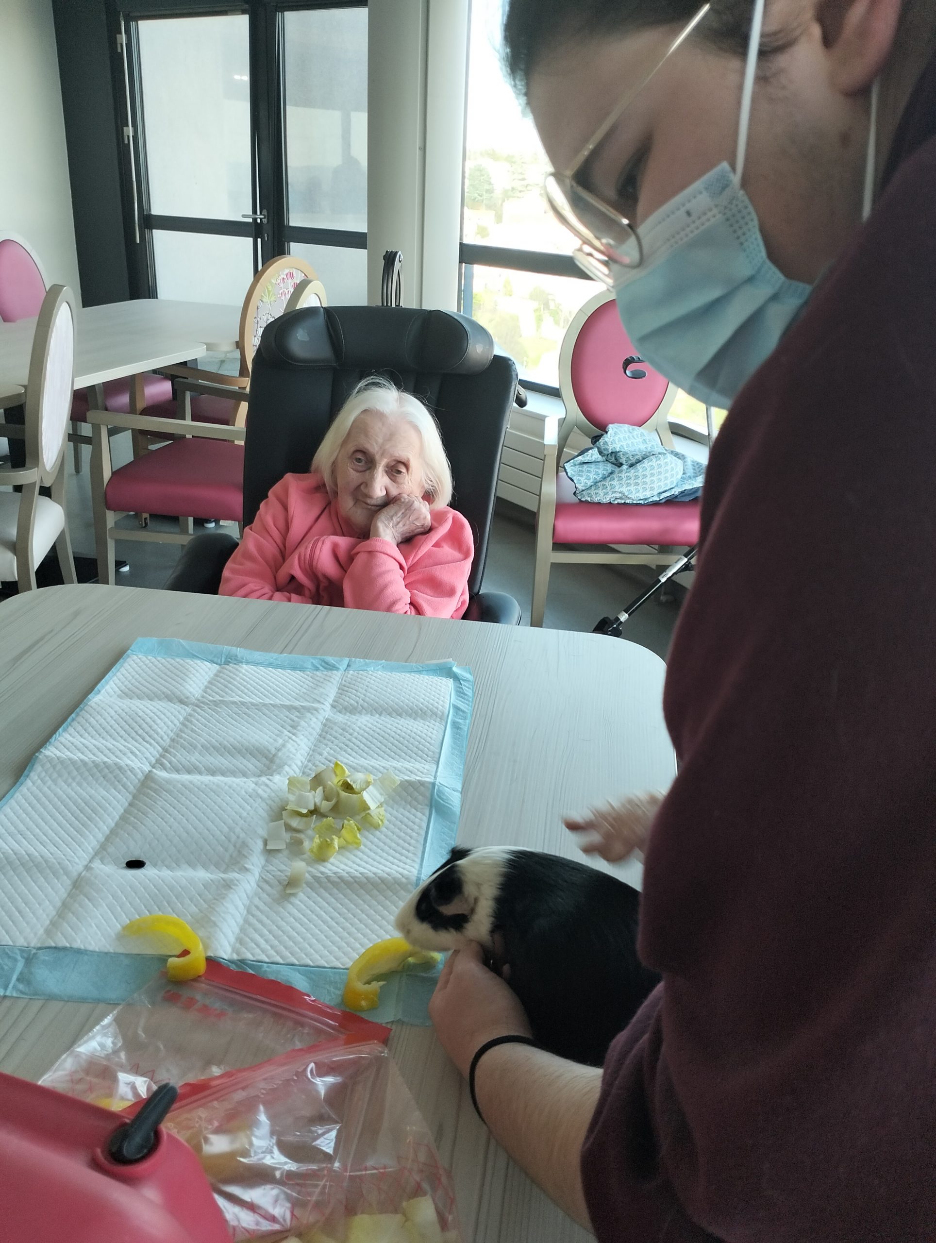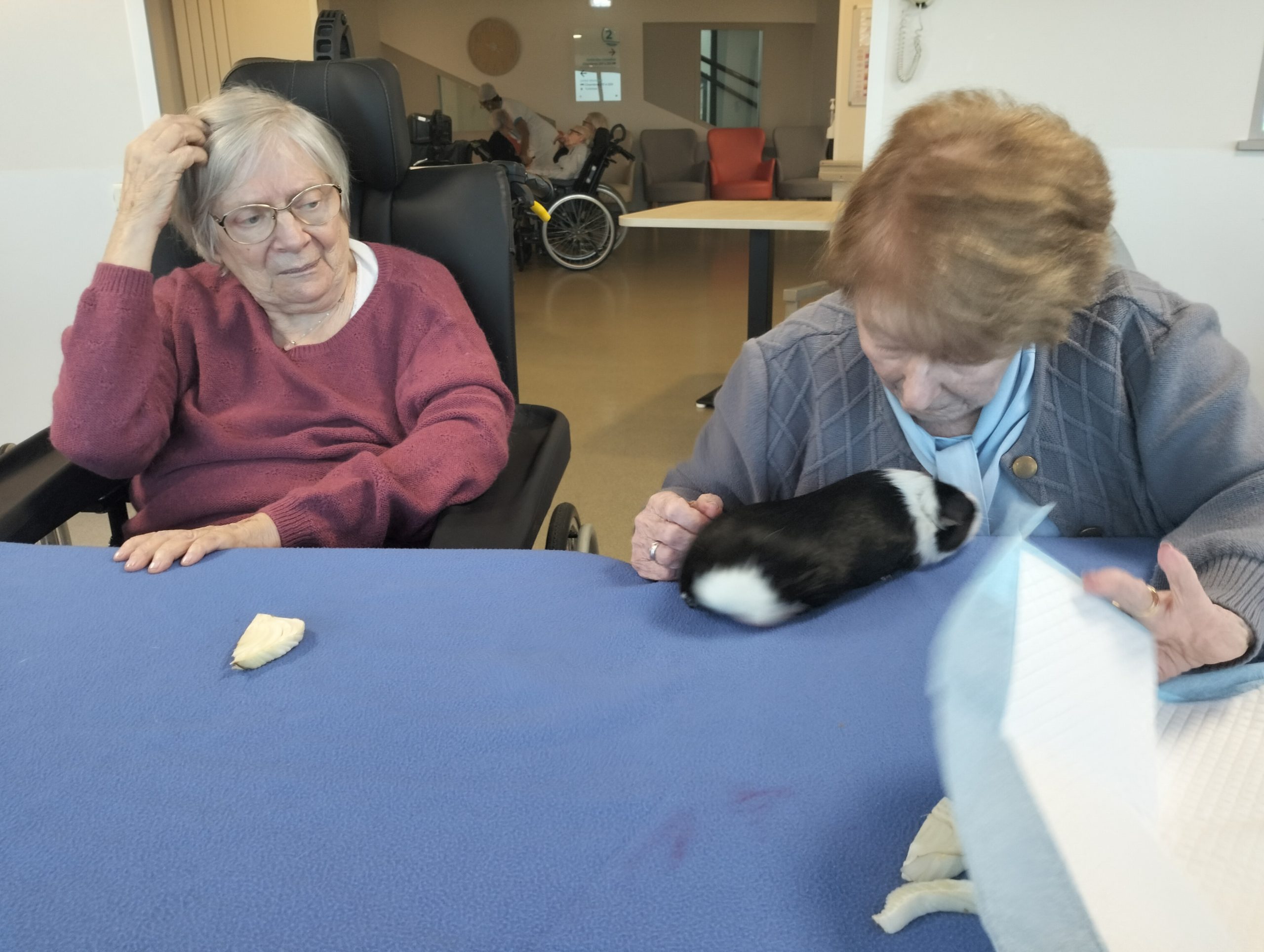 Artur en service civique aux Amandines est venu avec ses deux cochons d’inde le lundi 29 janvier. Il est passé dans chaque étage pour présenter ses petites bêtes. Les résidents intrigués et contents ont pu profiter de ce moment calme pour caresser ces animaux et discuter avec Arthur. Entre rires, surprises et moments de tendresse, les résidents profitent de ces temps de médiation animale pour se changer les idées. Merci à Arthur pour sa bienveillance.
