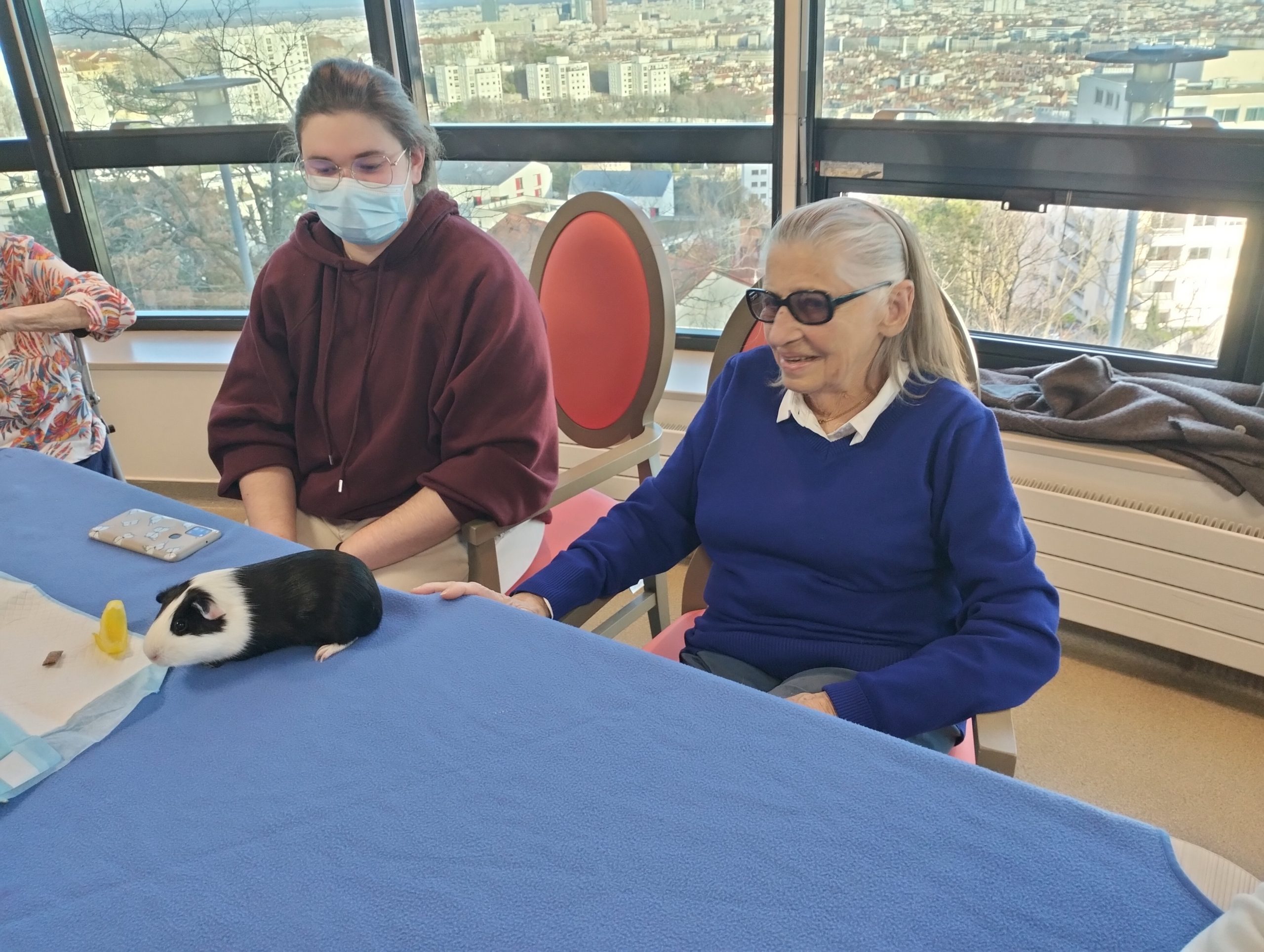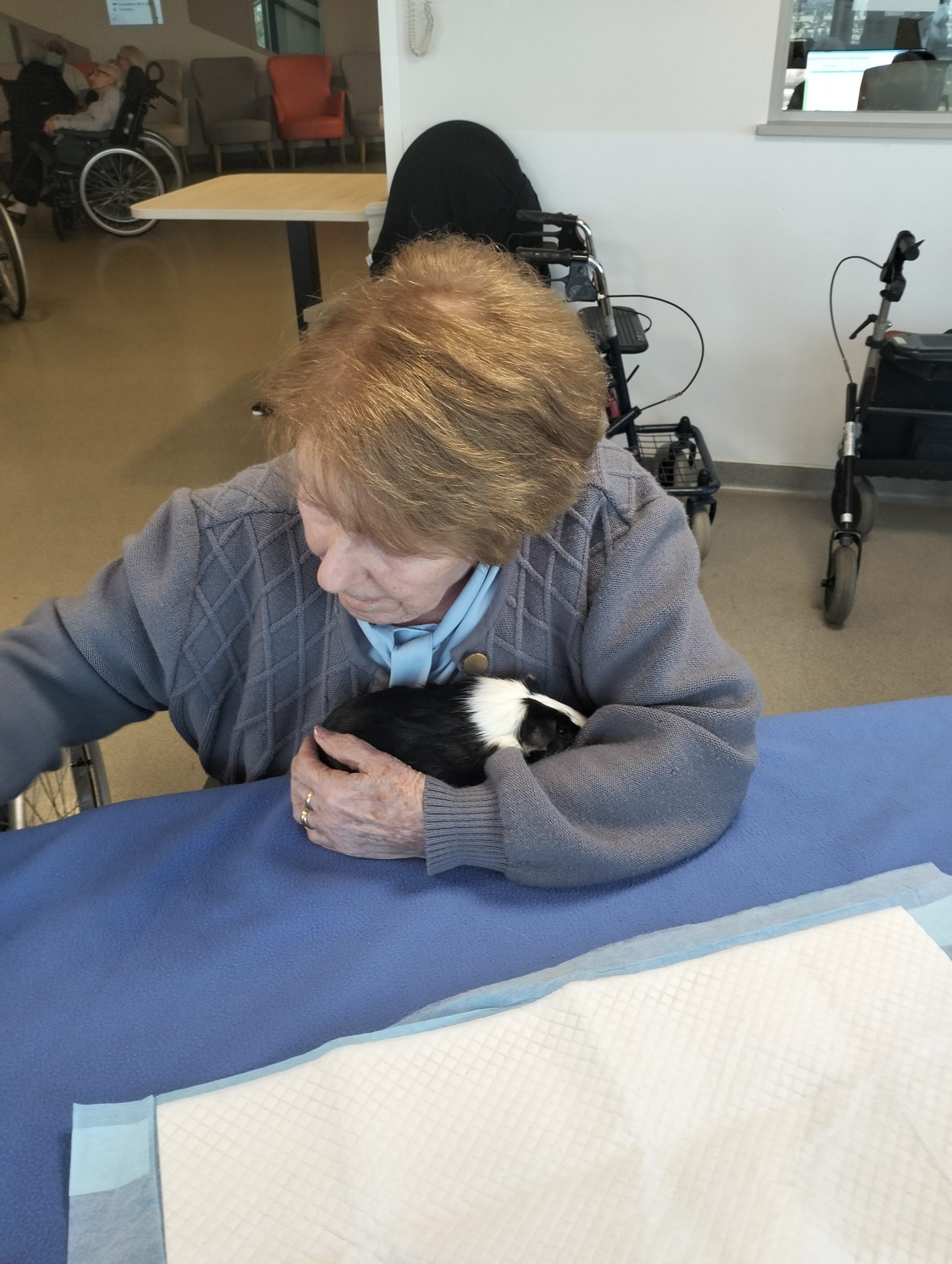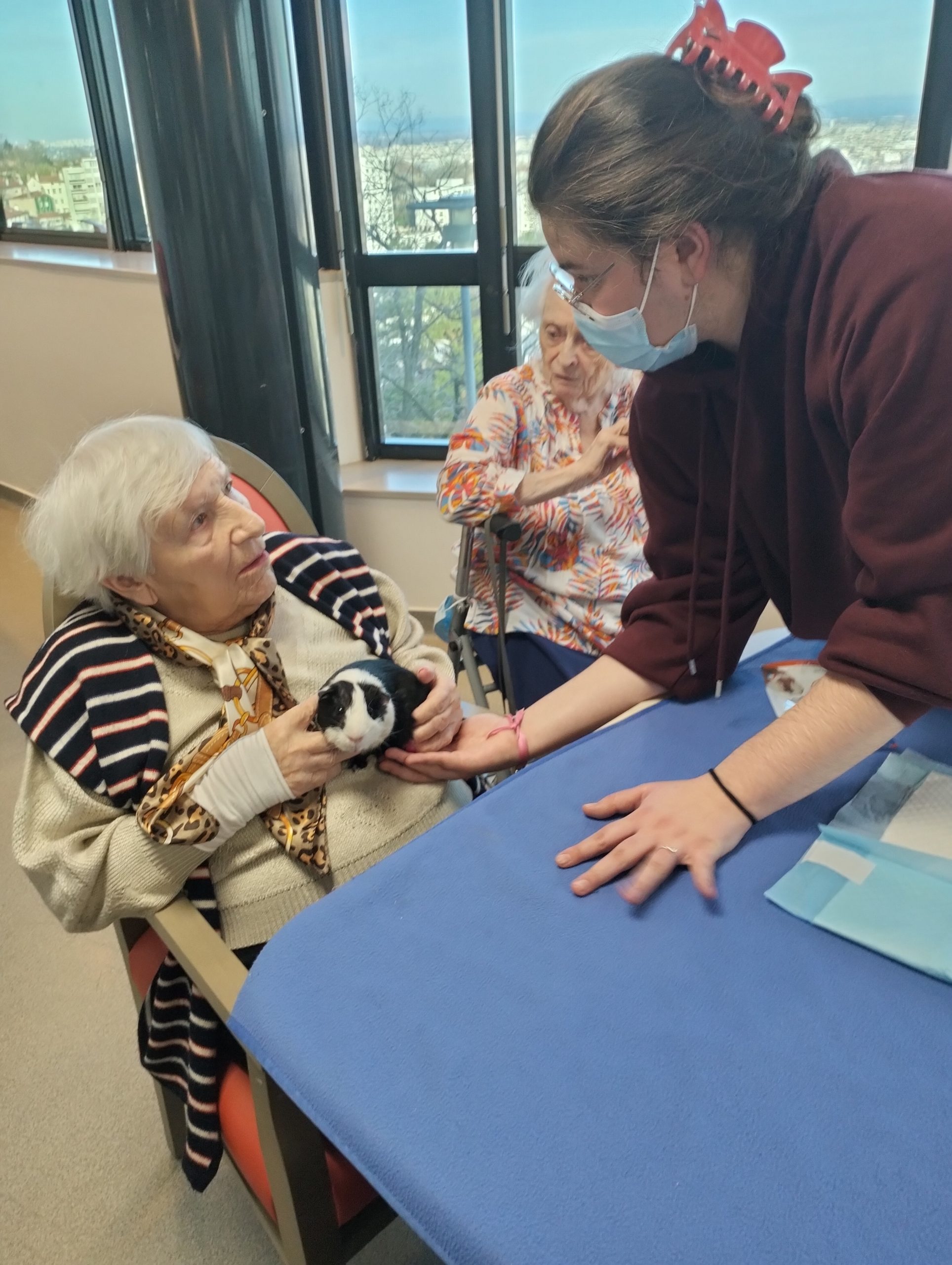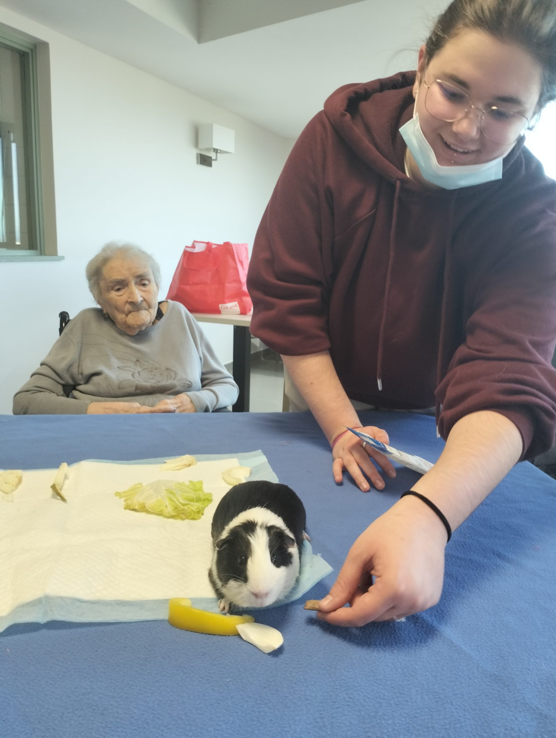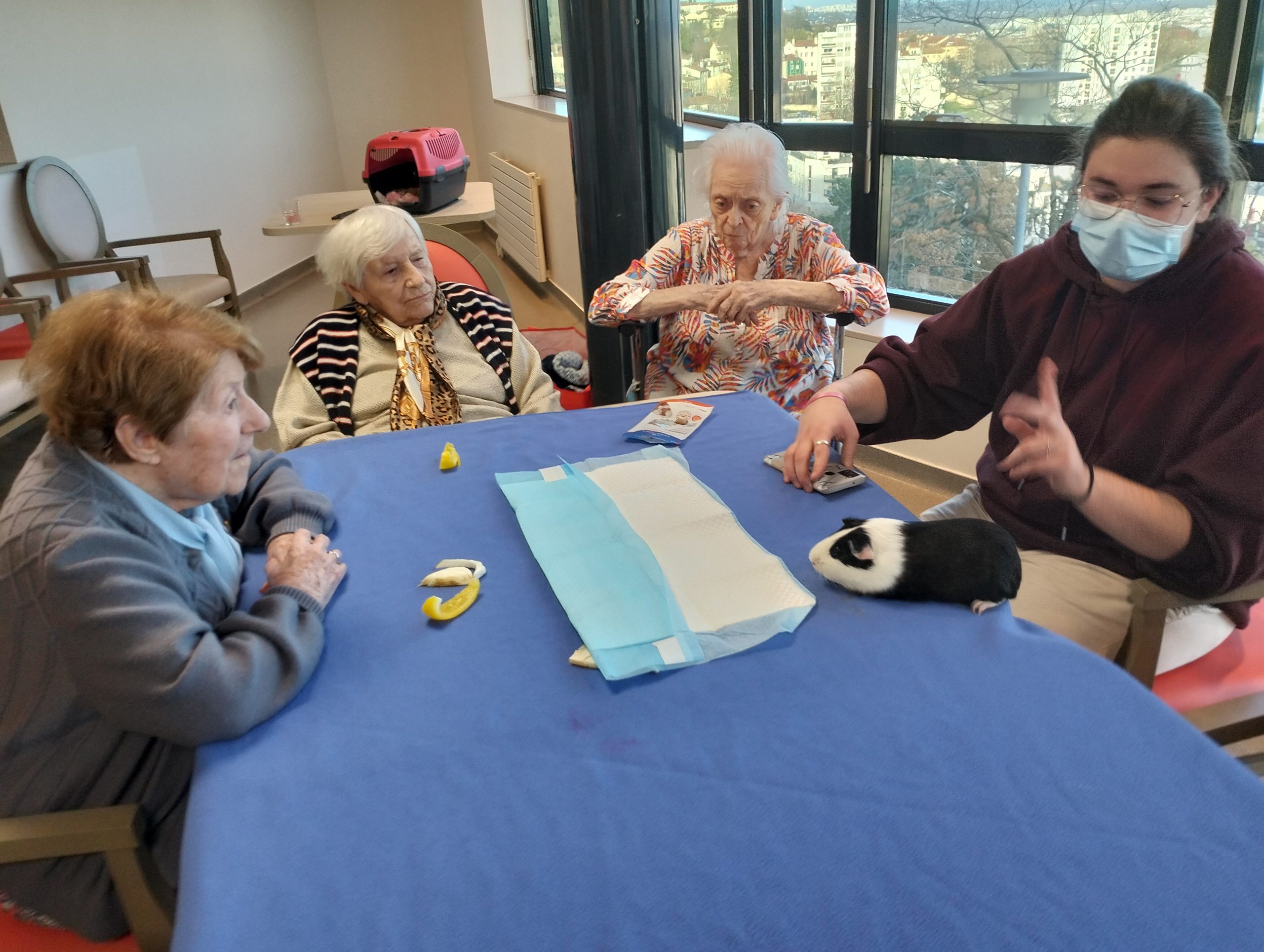 Artur en service civique aux Amandines est venu avec ses deux cochons d’inde le lundi 29 janvier. Il est passé dans chaque étage pour présenter ses petites bêtes. Les résidents intrigués et contents ont pu profiter de ce moment calme pour caresser ces animaux et discuter avec Arthur. Entre rires, surprises et moments de tendresse, les résidents profitent de ces temps de médiation animale pour se changer les idées. Merci à Arthur pour sa bienveillance.